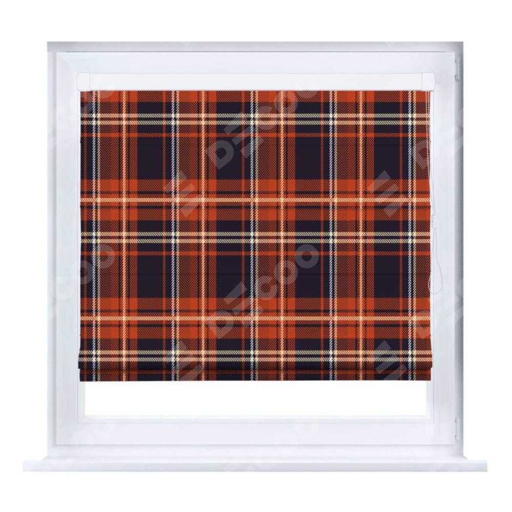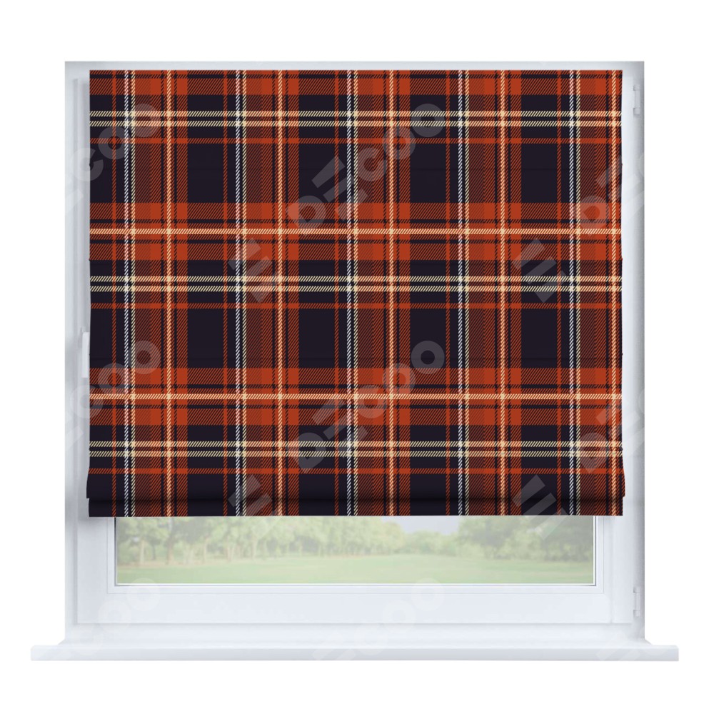 Римская штора производителя «Cortin», устанавливается на створку окна, пошита из ткани блэкаут с нанесением сублимационной печати «Сине-оранжевая клетка». Штора шьётся по индивидуальным размерам, для данного типа римской шторы возможная ширина от 35 до 150 см., высота до 250 см.