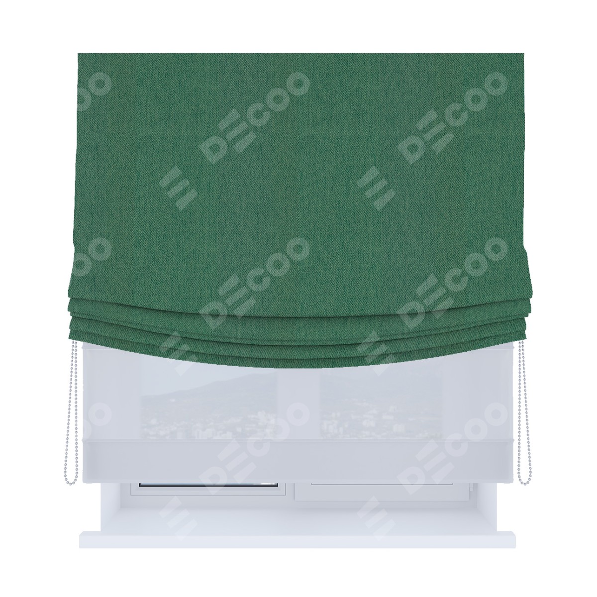 Римская штора день-ночь производителя «Cortin», используется для проёма, пошита из двух полотен, с лицевой стороны твид блэкаут зелёный артикул 21589, вторая ткань тюль (по стандарту комплектуется тюль белого цвета артикул V-01). Имеет универсальный механизм и подходит для монтажа: на потолок, на стену и в нишу. Удобное управление каждой шторой отдельно.