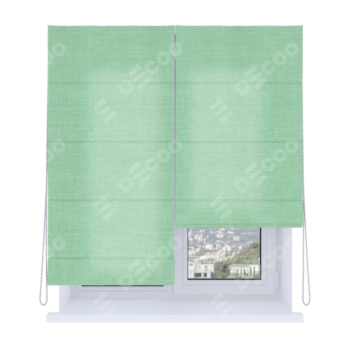 Римская штора производителя «Cortin», используется для проёма, пошита из ткани лён светло-бирюзовый, артикул ткани 74737. Имеет универсальный механизм и подходит для монтажа: на потолок, на стену и в нишу. Удобное управление каждой шторой отдельно.