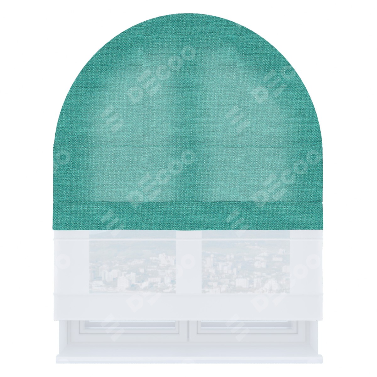 Римская штора день-ночь производителя «Cortin», используется для арочного проёма, пошита из двух полотен, с лицевой стороны лён изумрудный артикул 85908, вторая ткань тюль (по стандарту комплектуется тюль белого цвета артикул V-01). Штора шьётся по индивидуальным размерам, для данного типа римской шторы возможная ширина от 60 до 300 см. Удобное управление каждой шторой отдельно.