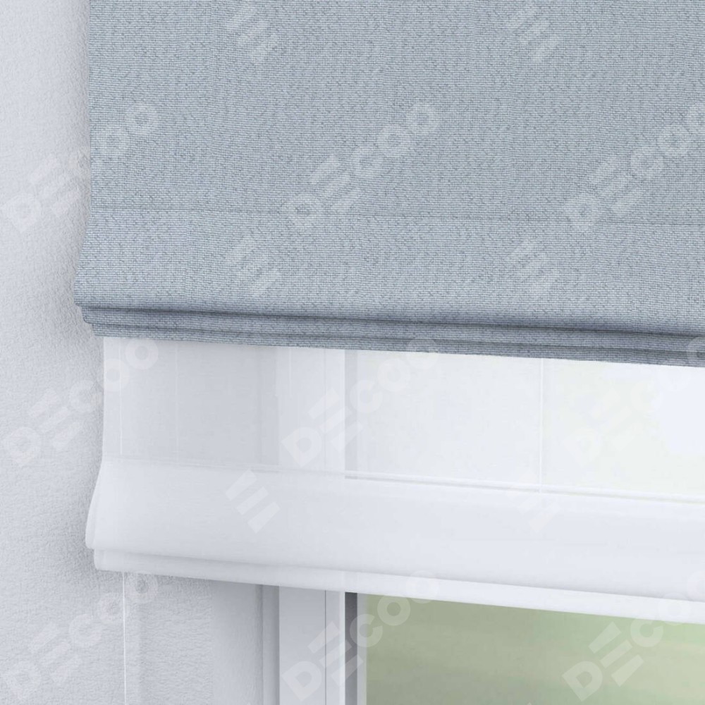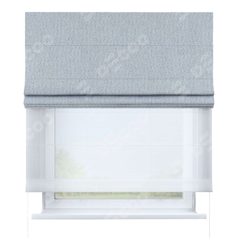 Римская штора день-ночь производителя «Cortin», используется для проёма, пошита из двух полотен, с лицевой стороны лён димаут серый артикул F3, вторая ткань тюль (по стандарту комплектуется тюль белого цвета артикул V-01). Имеет универсальный механизм и подходит для монтажа: на потолок, на стену и в нишу.
