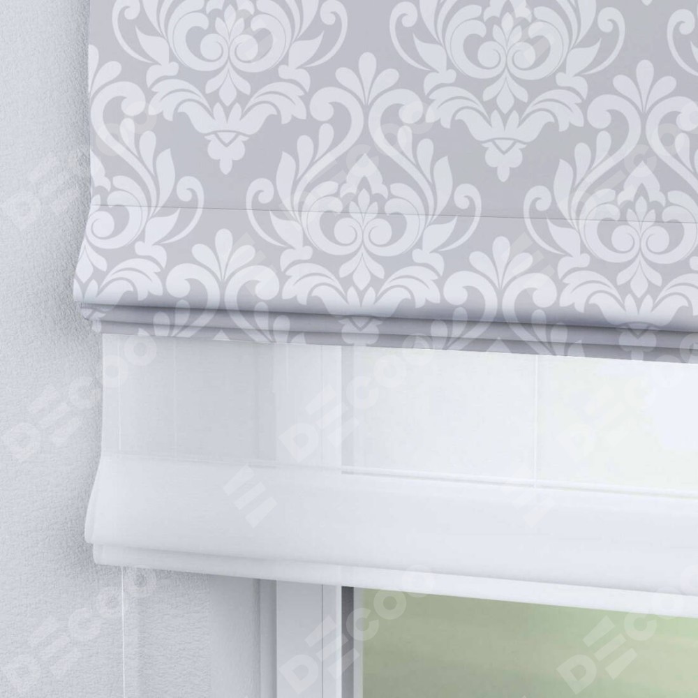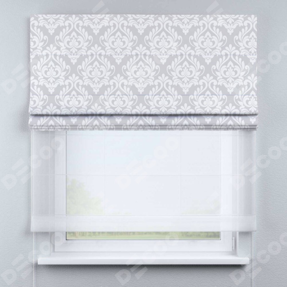Римская штора день-ночь производителя «Cortin», используется для проёма, пошита из двух полотен, с лицевой блэкаут с нанесением сублимационной печати «Дамаск светлый», вторая ткань тюль (по стандарту комплектуется тюль белого цвета артикул V-01). Имеет универсальный механизм и подходит для монтажа: на потолок, на стену и в нишу.