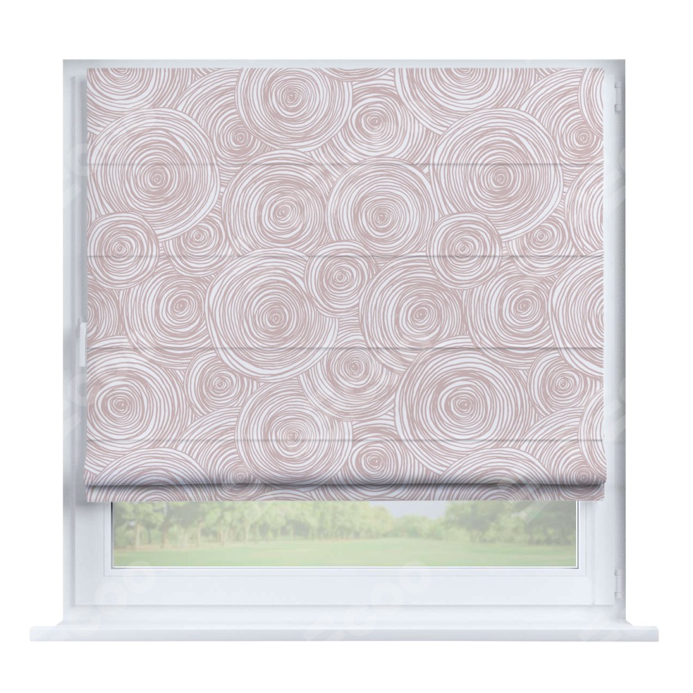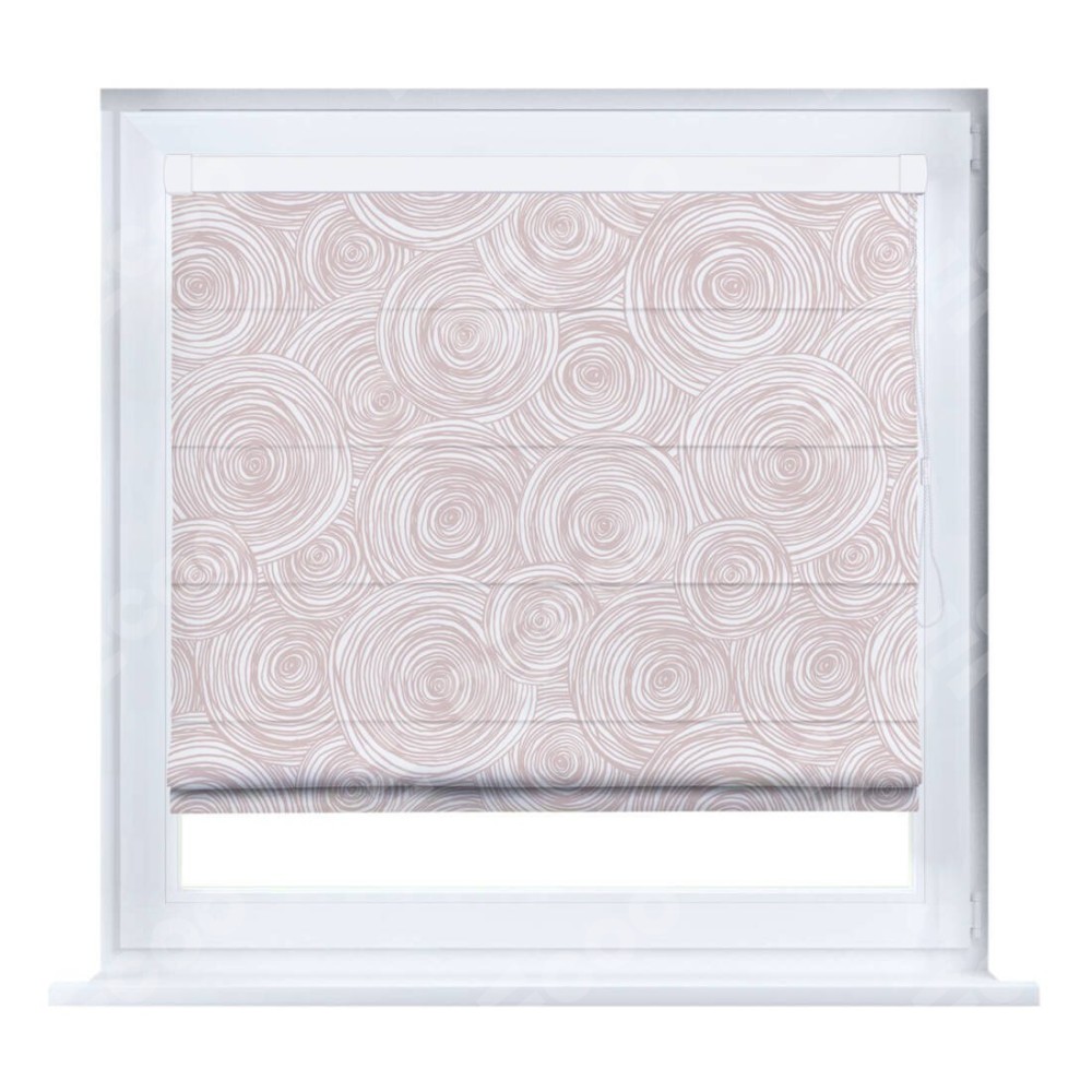 Римская штора производителя «Cortin», устанавливается на створку окна, пошита из ткани блэкаут с нанесением сублимационной печати «Бежевые круги». Штора шьётся по индивидуальным размерам, для данного типа римской шторы возможная ширина от 35 до 150 см., высота до 250 см.