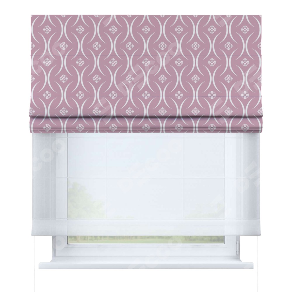 Римская штора день-ночь производителя «Cortin», используется для проёма, пошита из двух полотен, с лицевой блэкаут с нанесением сублимационной печати «Воздушный узор розовый», вторая ткань тюль (по стандарту комплектуется тюль белого цвета артикул V-01). Имеет универсальный механизм и подходит для монтажа: на потолок, на стену и в нишу.