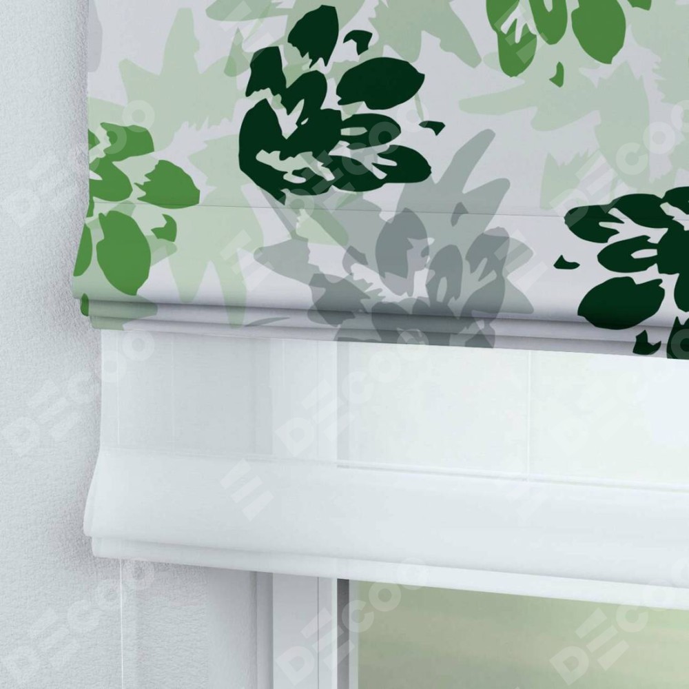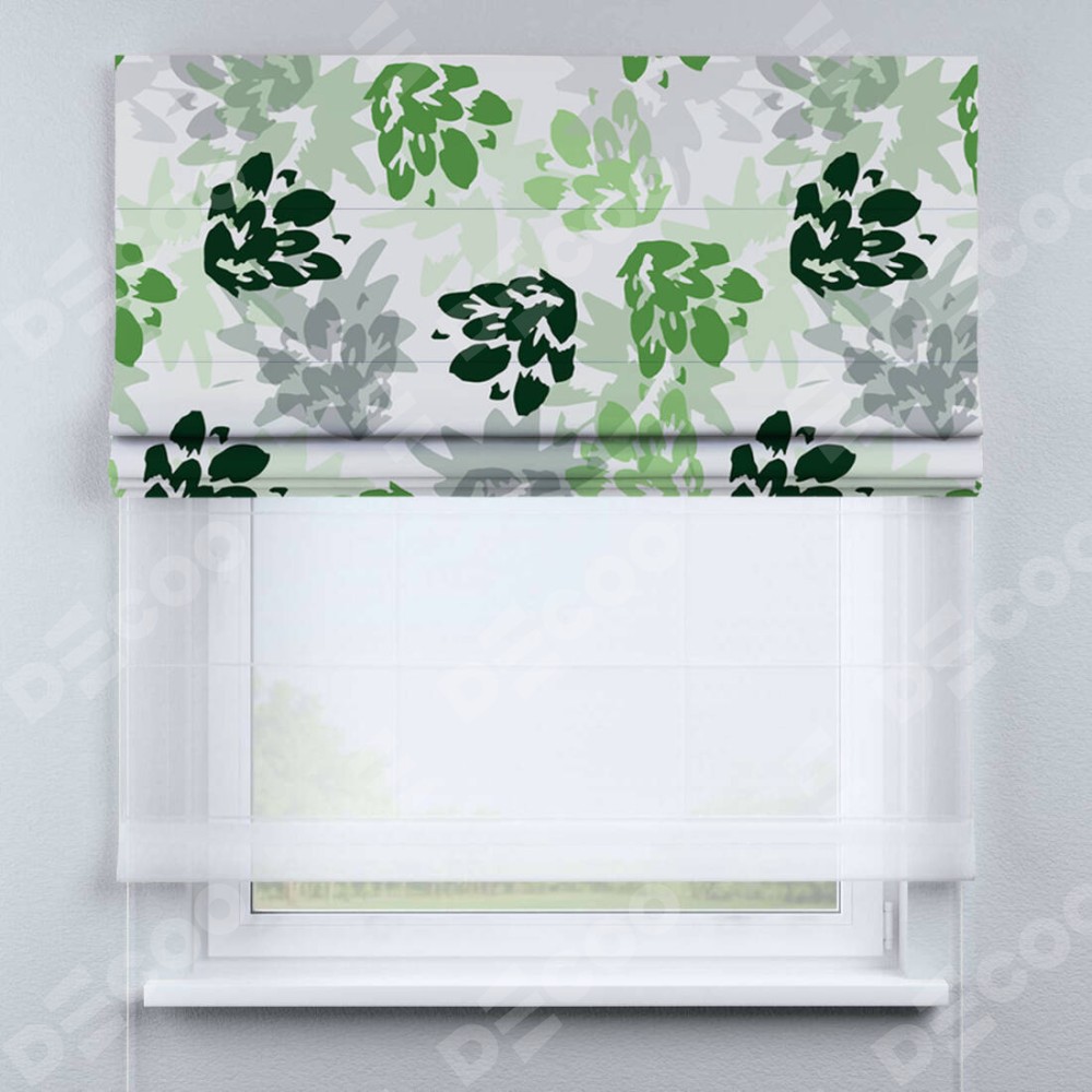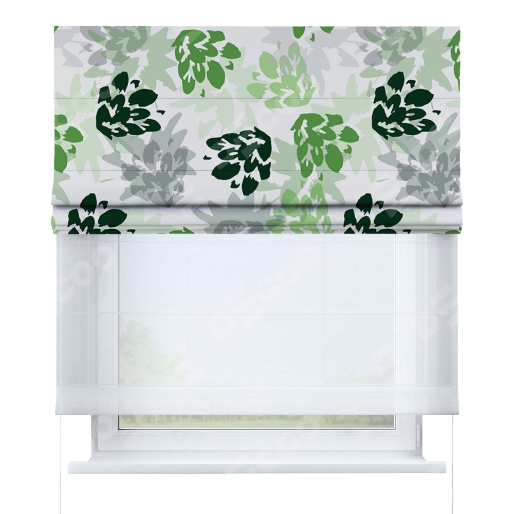 Римская штора день-ночь производителя «Cortin», используется для проёма, пошита из двух полотен, с лицевой блэкаут с нанесением сублимационной печати «Зелёный луг», вторая ткань тюль (по стандарту комплектуется тюль белого цвета артикул V-01). Имеет универсальный механизм и подходит для монтажа: на потолок, на стену и в нишу.