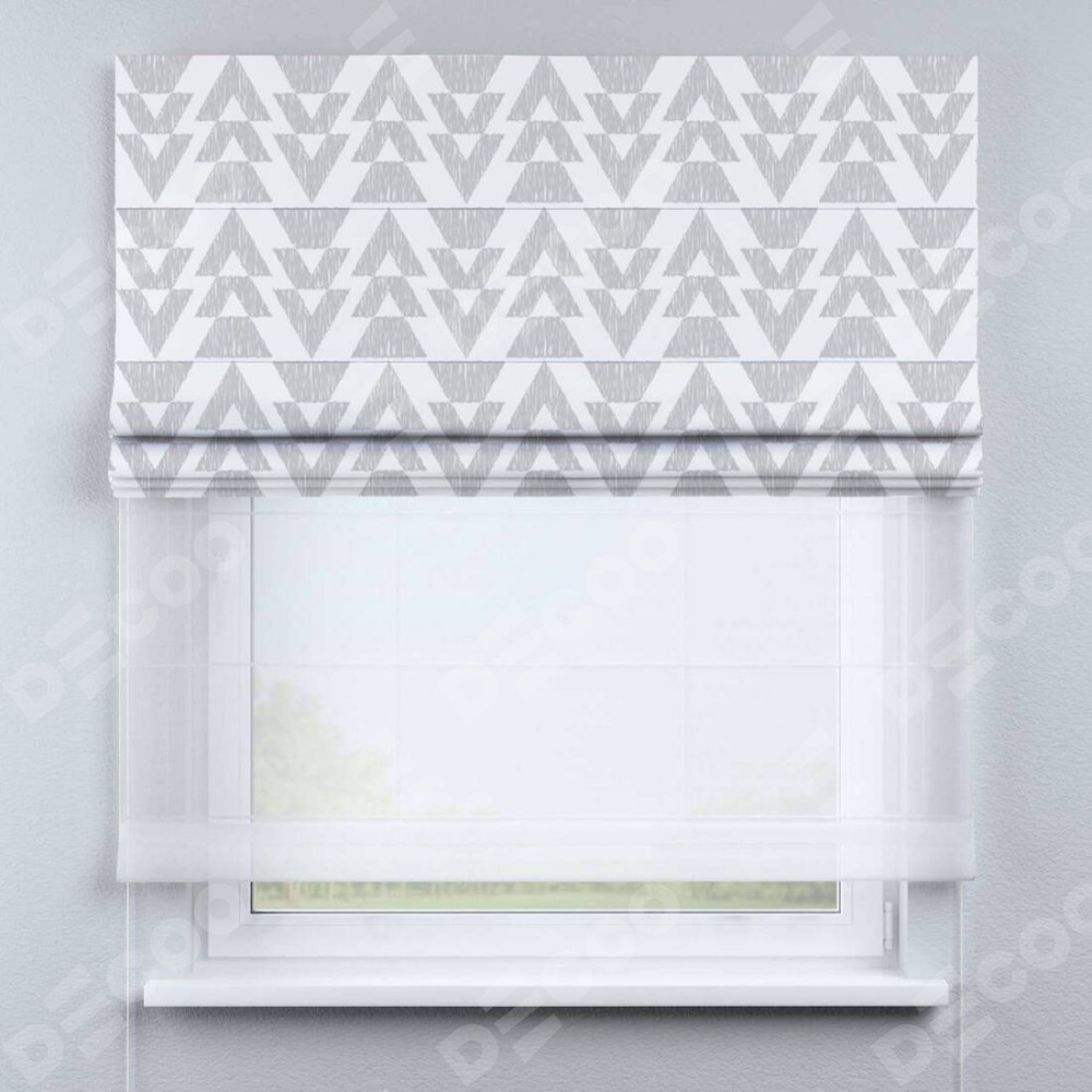 Римская штора день-ночь производителя «Cortin», используется для проёма, пошита из двух полотен, с лицевой блэкаут с нанесением сублимационной печати «Серые стрелки», вторая ткань тюль (по стандарту комплектуется тюль белого цвета артикул V-01). Имеет универсальный механизм и подходит для монтажа: на потолок, на стену и в нишу.