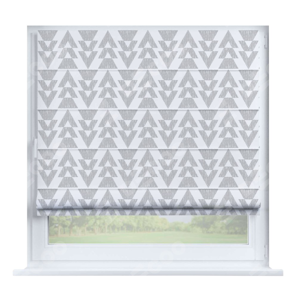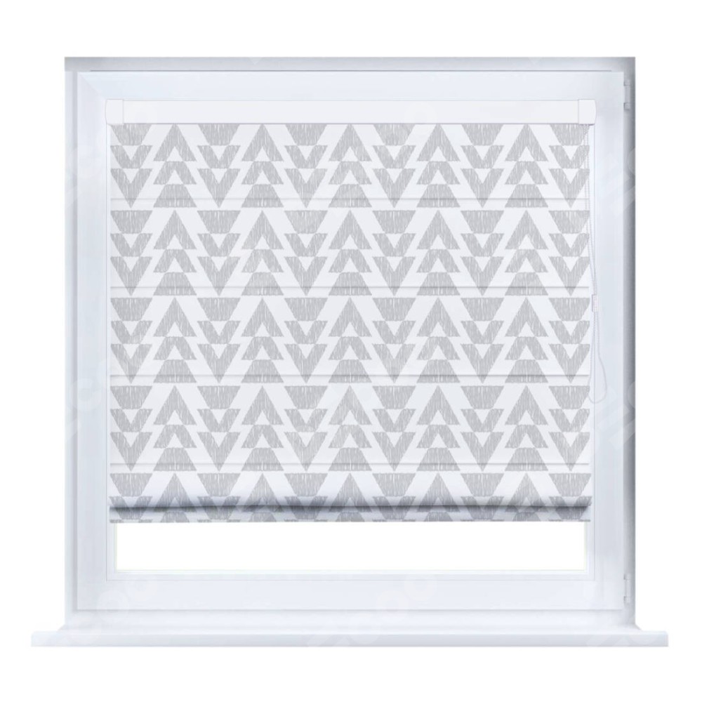 Римская штора производителя «Cortin», устанавливается на створку окна, пошита из ткани блэкаут с нанесением сублимационной печати «Серые стрелки». Штора шьётся по индивидуальным размерам, для данного типа римской шторы возможная ширина от 35 до 150 см., высота до 250 см.
