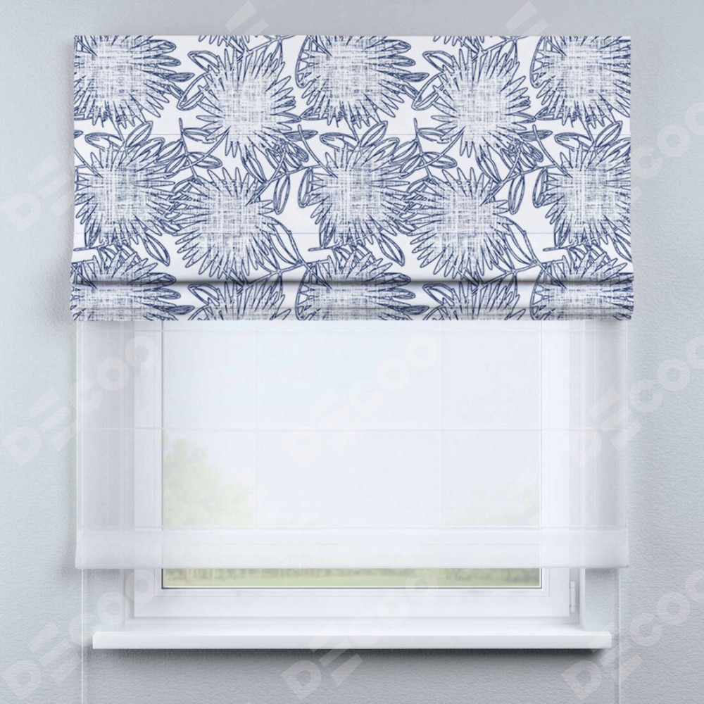 Римская штора день-ночь производителя «Cortin», используется для проёма, пошита из двух полотен, с лицевой блэкаут с нанесением сублимационной печати «Синий букет», вторая ткань тюль (по стандарту комплектуется тюль белого цвета артикул V-01). Имеет универсальный механизм и подходит для монтажа: на потолок, на стену и в нишу.