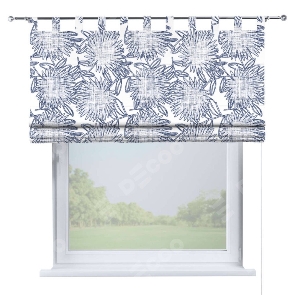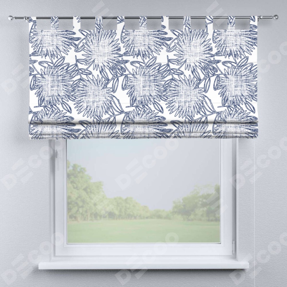 Римская штора производителя «Cortin», используется для проёма, пошита из ткани блэкаут с нанесением сублимационной печати «Синий букет». Данная модель пошита на петлях, комплектуется на выбор круглым карнизом и подходит для монтажа на стену. Римская штора на петлях имеет простую систему регулировки высоты, отличительным преимуществом данной модели является простой способ монтажа. Достаточно повесить ее на трубу и штора готова!