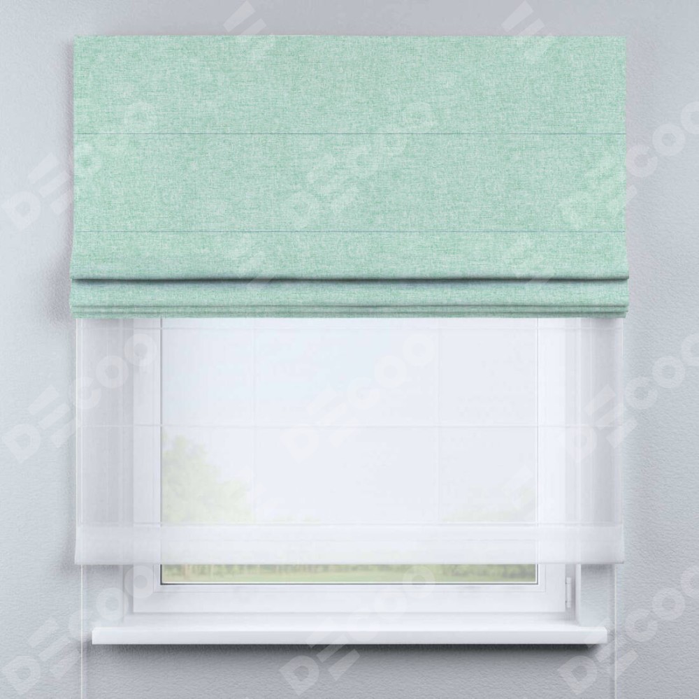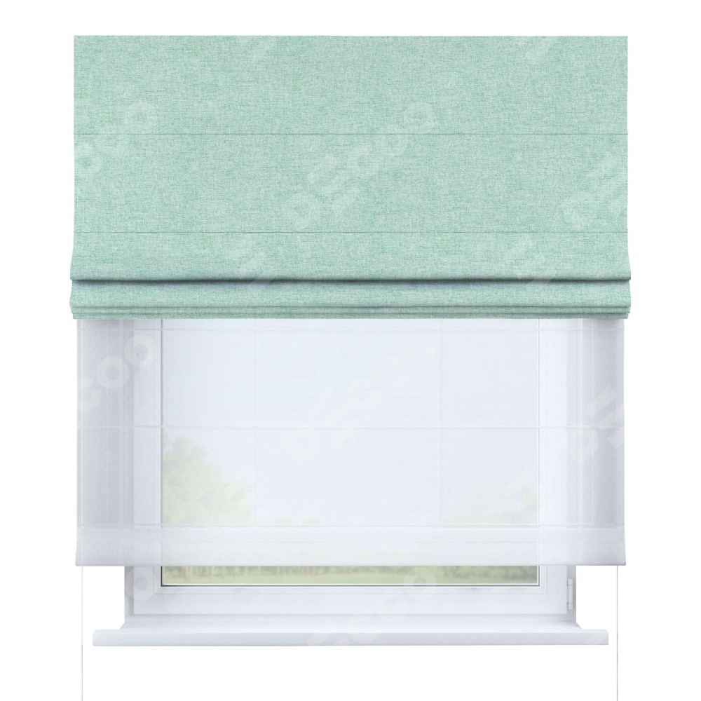Римская штора день-ночь производителя «Cortin», используется для проёма, пошита из двух полотен, с лицевой стороны лён кашемир мятный артикул 21617, вторая ткань тюль (по стандарту комплектуется тюль белого цвета артикул V-01). Имеет универсальный механизм и подходит для монтажа: на потолок, на стену и в нишу.