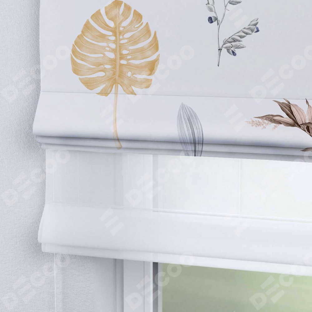 Римская штора день-ночь производителя «Cortin», используется для проёма, пошита из двух полотен, с лицевой блэкаут с нанесением сублимационной печати «Осенний коллаж», вторая ткань тюль (по стандарту комплектуется тюль белого цвета артикул V-01). Имеет универсальный механизм и подходит для монтажа: на потолок, на стену и в нишу.
