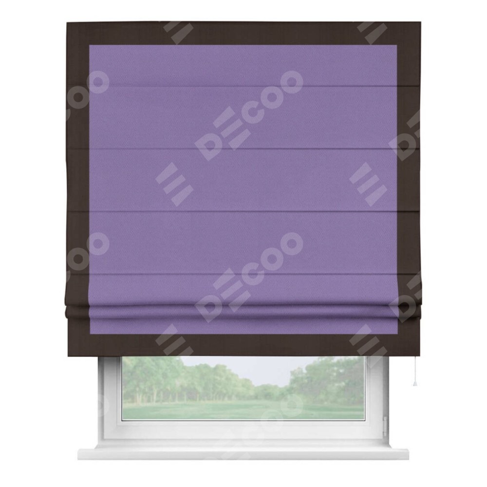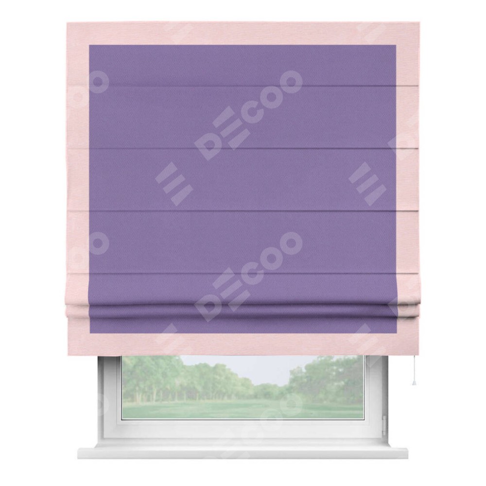 Римская штора производителя «Cortin», используется для проёма, пошита из ткани блэкаут однотонный сиреневый, артикул ткани 88305. Отделка шторы кантом «Чесс», ткань для канта используется из блэкаута однотонного разной расцветки на выбор. Имеет универсальный механизм и подходит для монтажа: на потолок, на стену и в нишу.