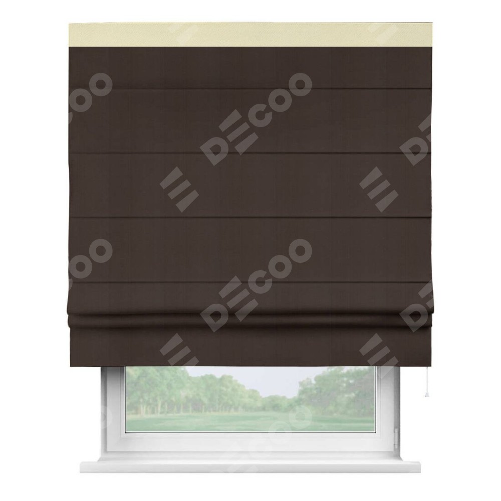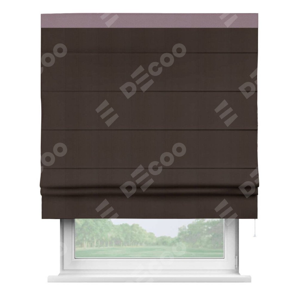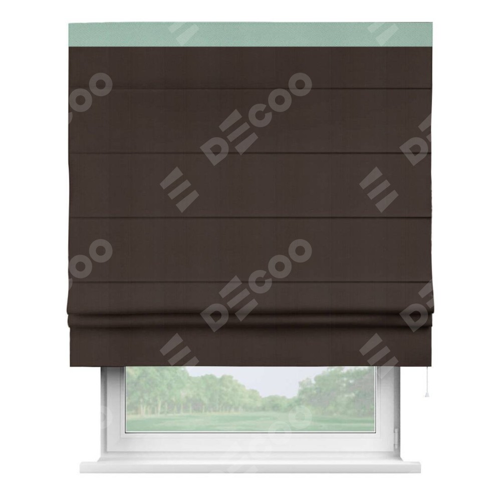 Римская штора производителя «Cortin», используется для проёма, пошита из ткани блэкаут однотонный тёмно-коричневый, артикул ткани 88287. Отделка шторы кантом «Кинг», ткань для канта используется из блэкаута однотонного разной расцветки на выбор. Имеет универсальный механизм и подходит для монтажа: на потолок, на стену и в нишу.
