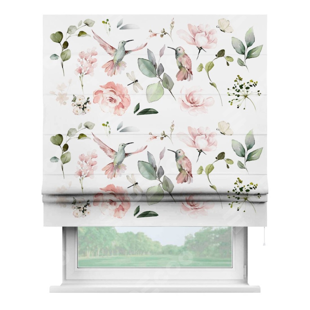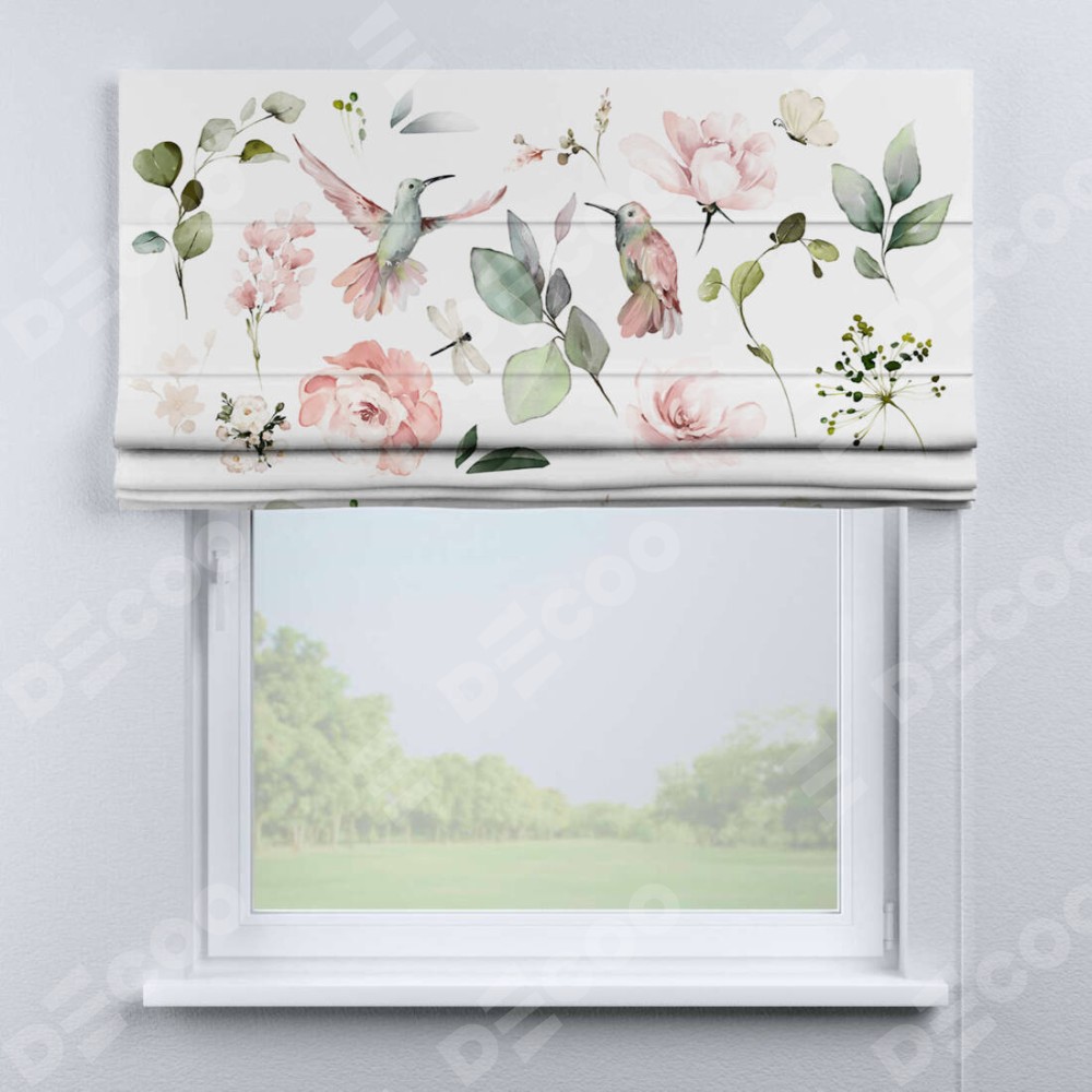 Римская штора производителя «Cortin», используется для проёма, пошита из ткани блэкаут с нанесением сублимационной печати «Уютный сад». Имеет универсальный механизм и подходит для монтажа: на потолок, на стену и в нишу.