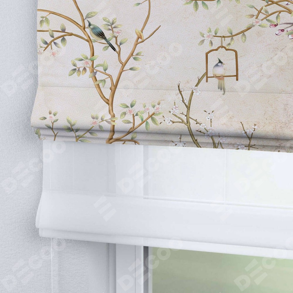 Римская штора день-ночь производителя «Cortin», используется для проёма, пошита из двух полотен, с лицевой блэкаут с нанесением сублимационной печати «Весенний сад», вторая ткань тюль (по стандарту комплектуется тюль белого цвета артикул V-01). Имеет универсальный механизм и подходит для монтажа: на потолок, на стену и в нишу.
