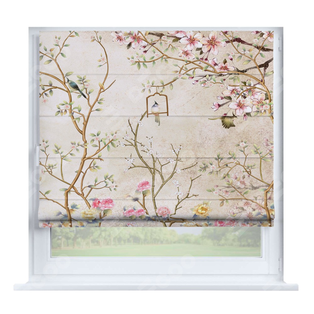Римская штора производителя «Cortin», устанавливается на створку окна, пошита из ткани блэкаут с нанесением сублимационной печати «Весенний сад». Штора шьётся по индивидуальным размерам, для данного типа римской шторы возможная ширина от 35 до 150 см., высота до 250 см.