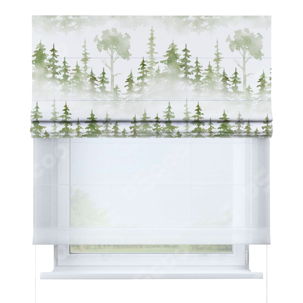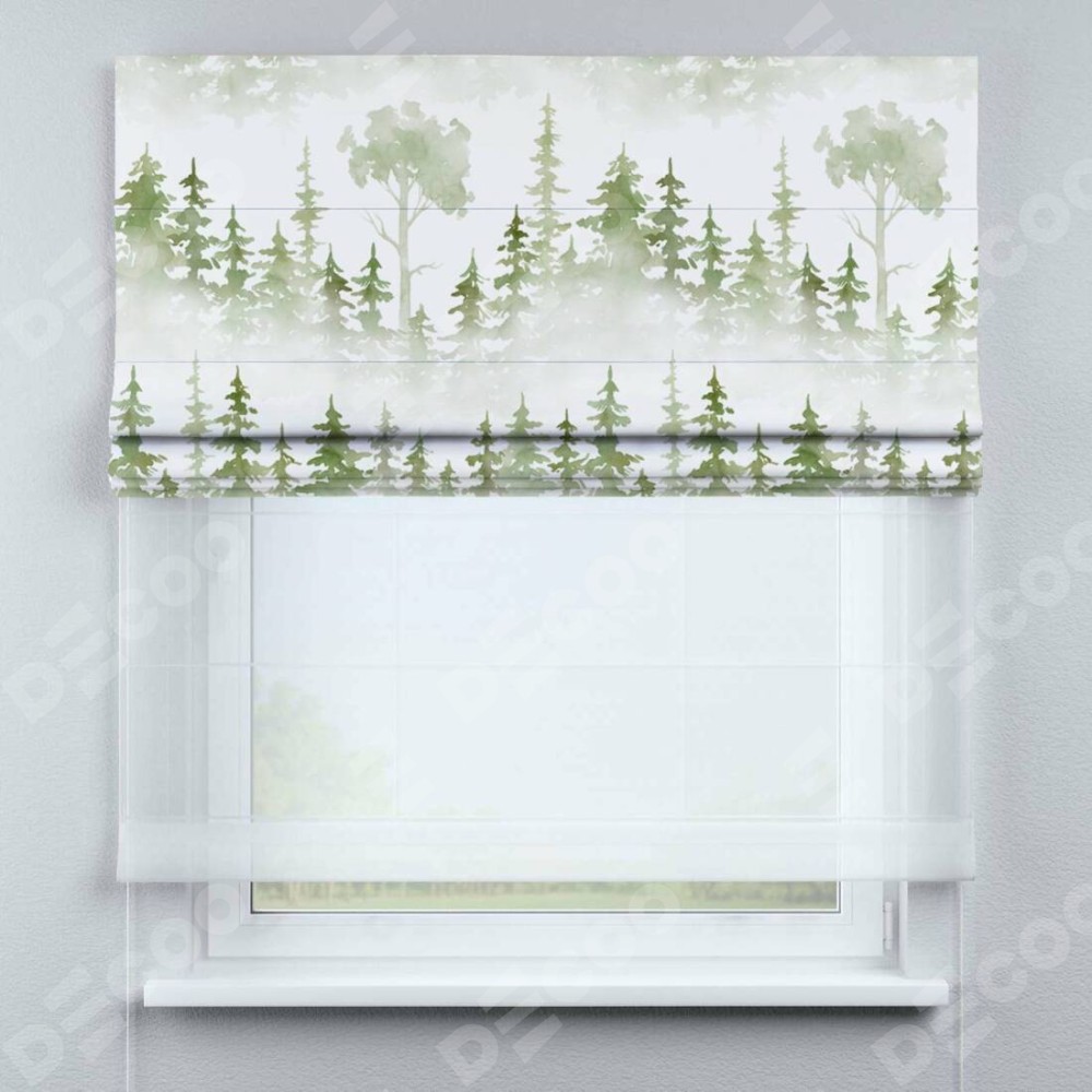 Римская штора день-ночь производителя «Cortin», используется для проёма, пошита из двух полотен, с лицевой блэкаут с нанесением сублимационной печати «Туманный лес», вторая ткань тюль (по стандарту комплектуется тюль белого цвета артикул V-01). Имеет универсальный механизм и подходит для монтажа: на потолок, на стену и в нишу.