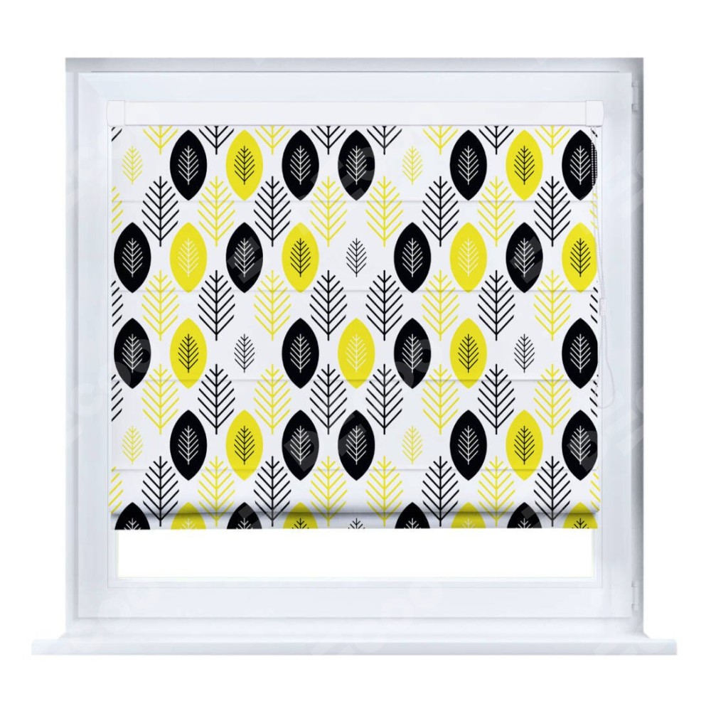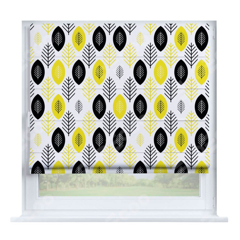 Римская штора производителя «Cortin», устанавливается на створку окна, пошита из ткани блэкаут с нанесением сублимационной печати «Черно-желтый модерн». Штора шьётся по индивидуальным размерам, для данного типа римской шторы возможная ширина от 35 до 150 см., высота до 250 см.