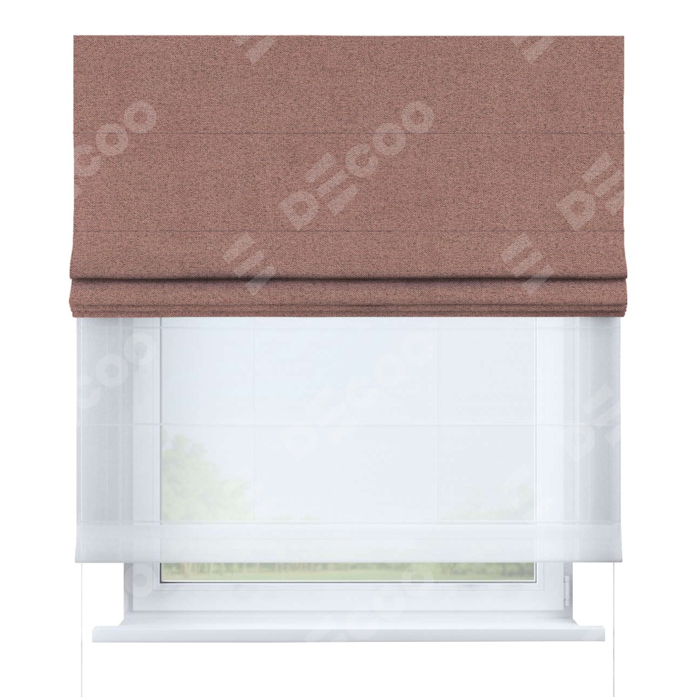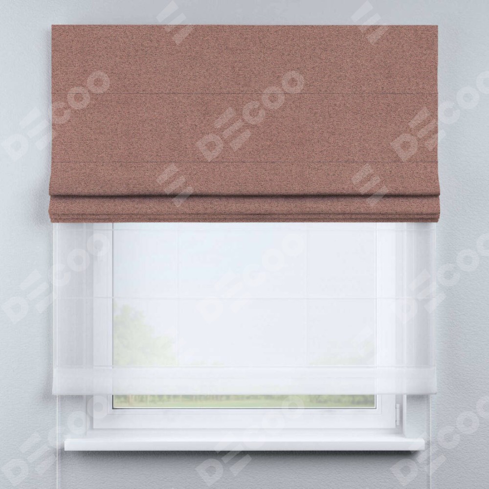Римская штора день-ночь производителя «Cortin», используется для проёма, пошита из двух полотен, с лицевой стороны лён блэкаут розовый артикул 69575, вторая ткань тюль (по стандарту комплектуется тюль белого цвета артикул V-01). Имеет универсальный механизм и подходит для монтажа: на потолок, на стену и в нишу.