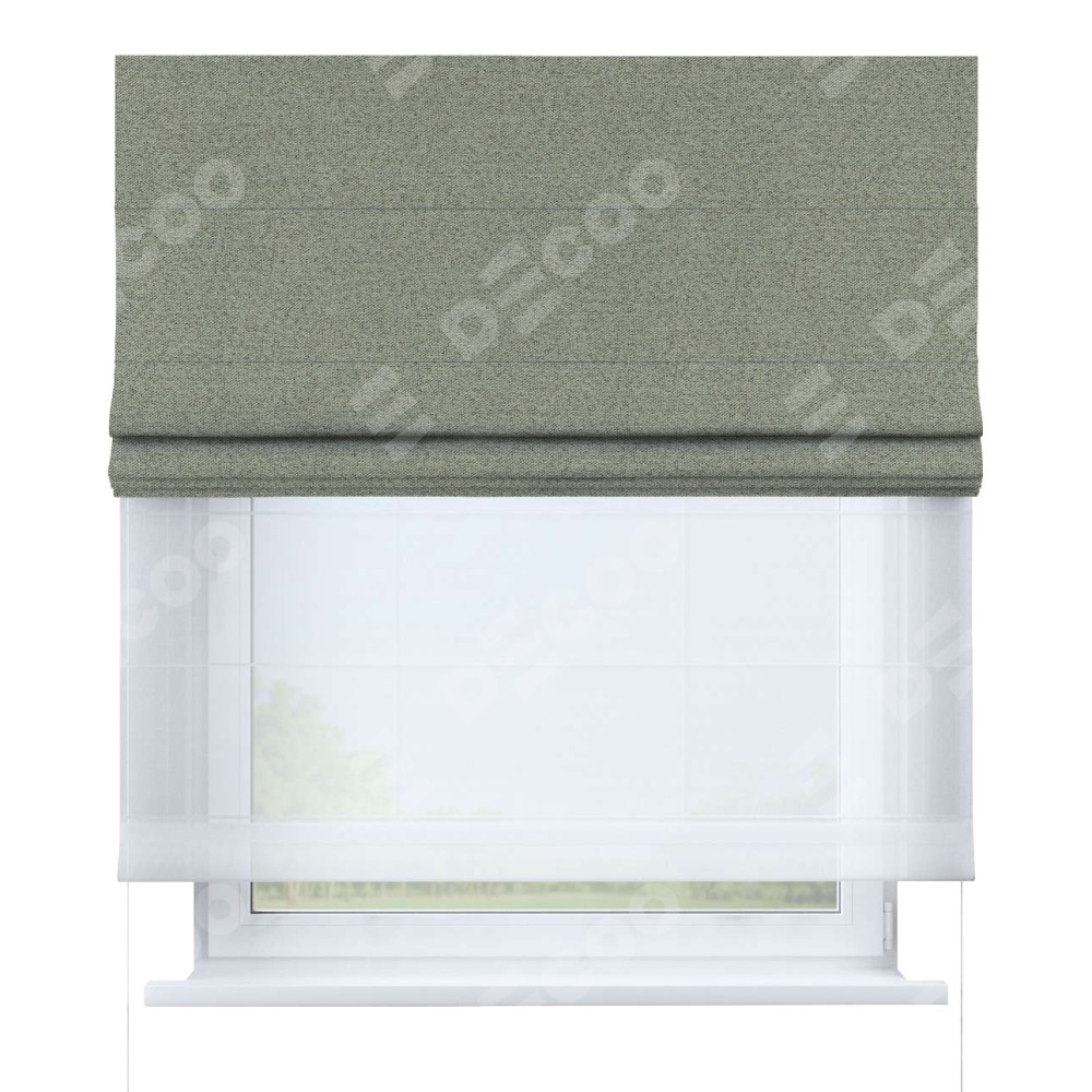 Римская штора день-ночь производителя «Cortin», используется для проёма, пошита из двух полотен, с лицевой стороны лён блэкаут светло-серый артикул 69446, вторая ткань тюль (по стандарту комплектуется тюль белого цвета артикул V-01). Имеет универсальный механизм и подходит для монтажа: на потолок, на стену и в нишу.