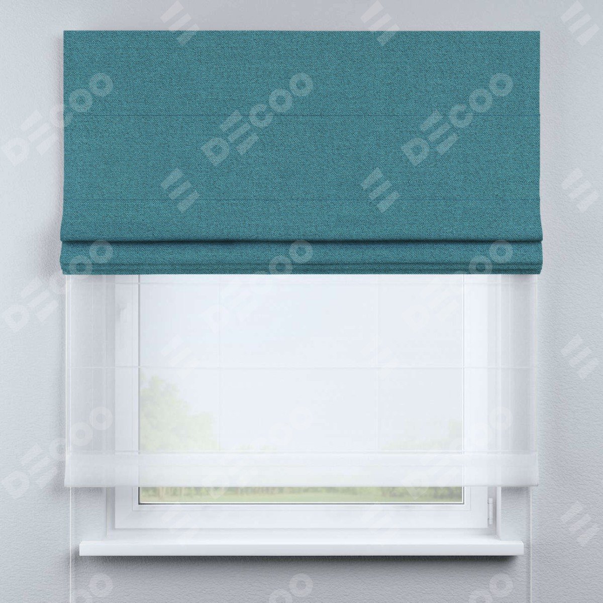 Римская штора день-ночь производителя «Cortin», используется для проёма, пошита из двух полотен, с лицевой стороны лён блэкаут синий артикул 69528, вторая ткань тюль (по стандарту комплектуется тюль белого цвета артикул V-01). Имеет универсальный механизм и подходит для монтажа: на потолок, на стену и в нишу. Удобное управление каждой шторой отдельно.