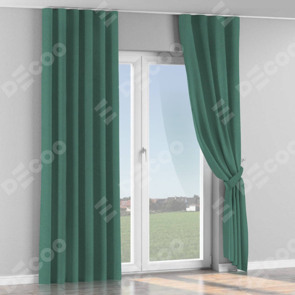 Комплект прямых штор, от производителя «Cortin», пошиты из ткани лён блэкаут бирюзовый, артикул ткани 69517. С изнаночной стороны в верхней части штор пристрачивается шторная лента с декоративными складками «Волна». Для создания элегантных складок прямые шторы шьются по стандарту с коэффициентом 1:2 (на 100 см. ширины проёма 200 см. ширины ткани).