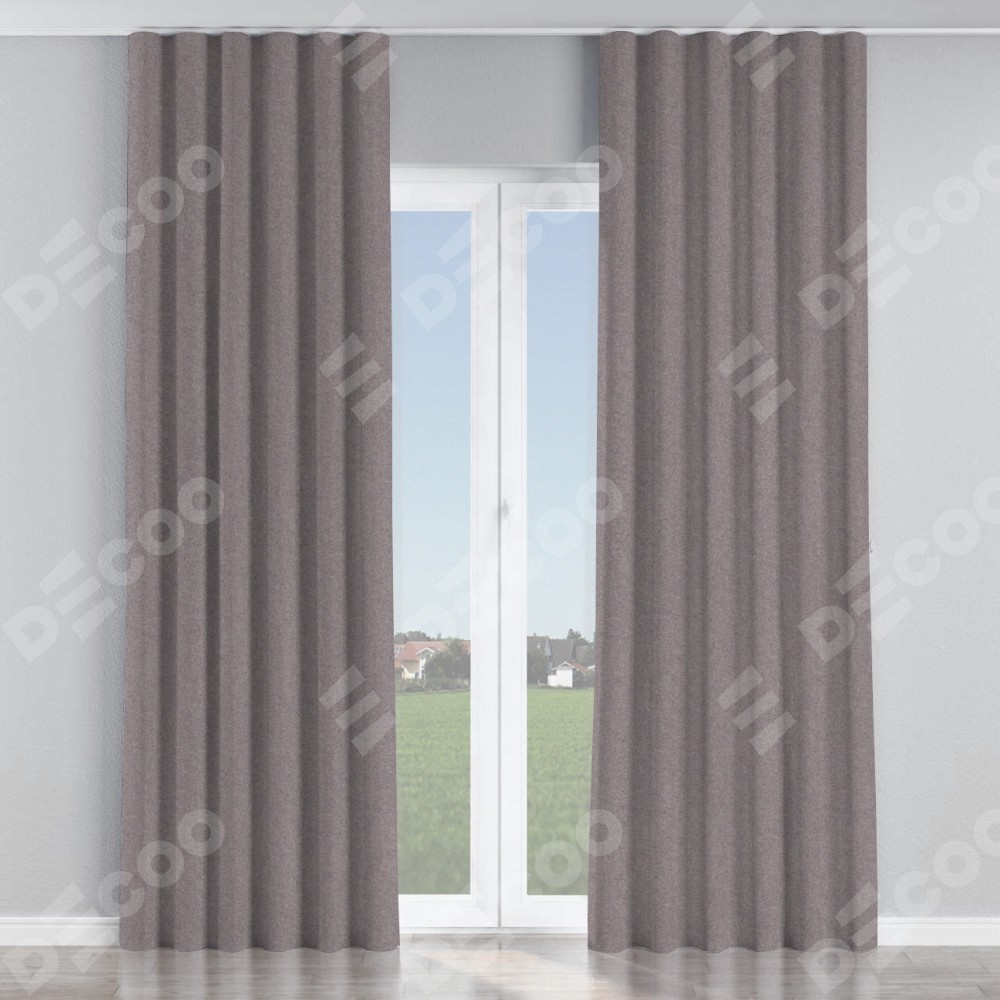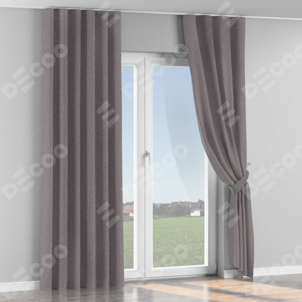 Комплект прямых штор, от производителя «Cortin», пошиты из ткани лён блэкаут сиреневый, артикул ткани 69576. С изнаночной стороны в верхней части штор пристрачивается шторная лента с декоративными складками «Волна». Для создания элегантных складок прямые шторы шьются по стандарту с коэффициентом 1:2 (на 100 см. ширины проёма 200 см. ширины ткани).