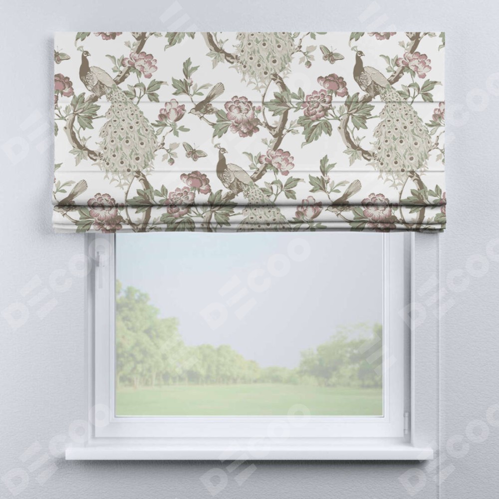 Римская штора производителя «Cortin», используется для проёма, пошита из ткани блэкаут с нанесением сублимационной печати «Гордые павлины». Имеет универсальный механизм и подходит для монтажа: на потолок, на стену и в нишу.