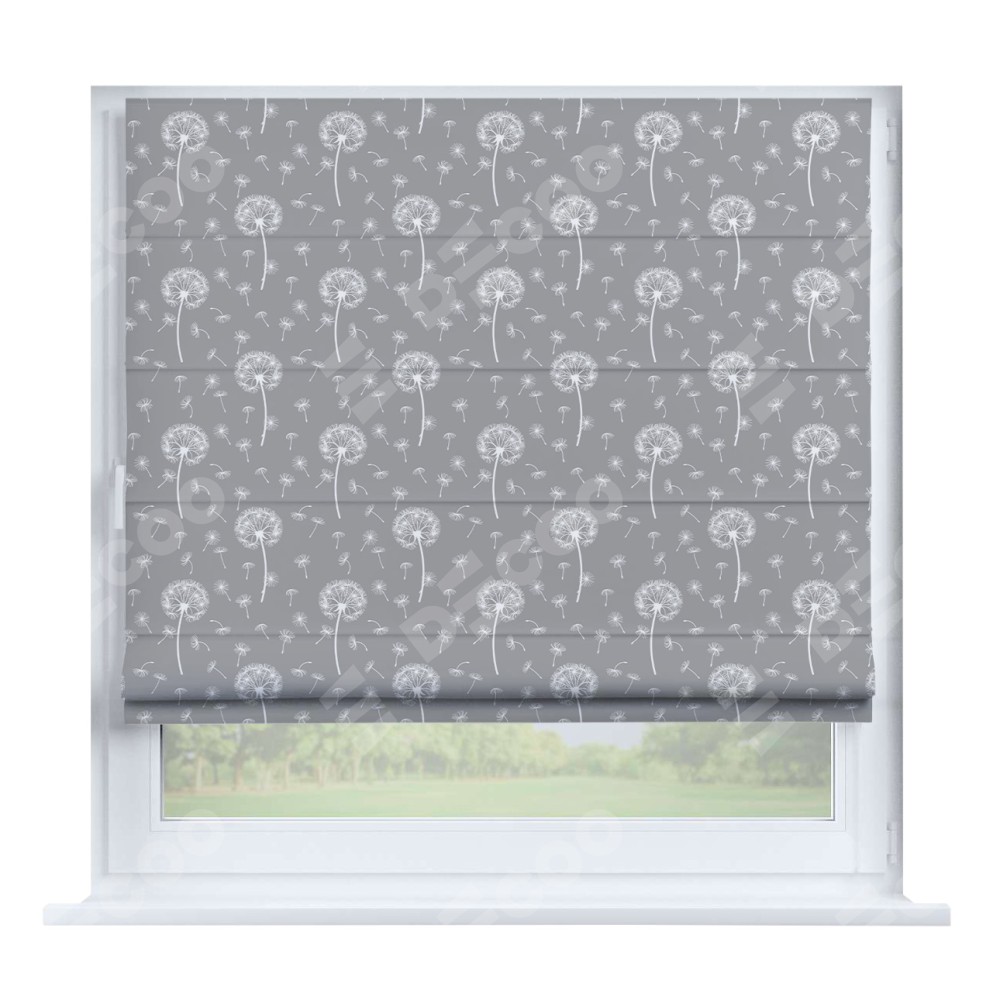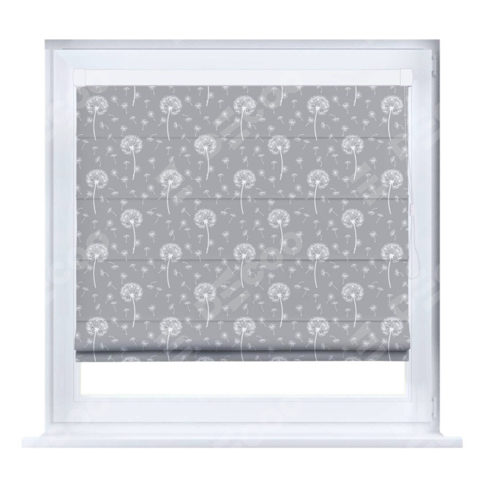Римская штора производителя «Cortin», устанавливается на створку окна, пошита из ткани блэкаут с нанесением сублимационной печати «Одуванчики». Штора шьётся по индивидуальным размерам, для данного типа римской шторы возможная ширина от 35 до 150 см., высота до 250 см.