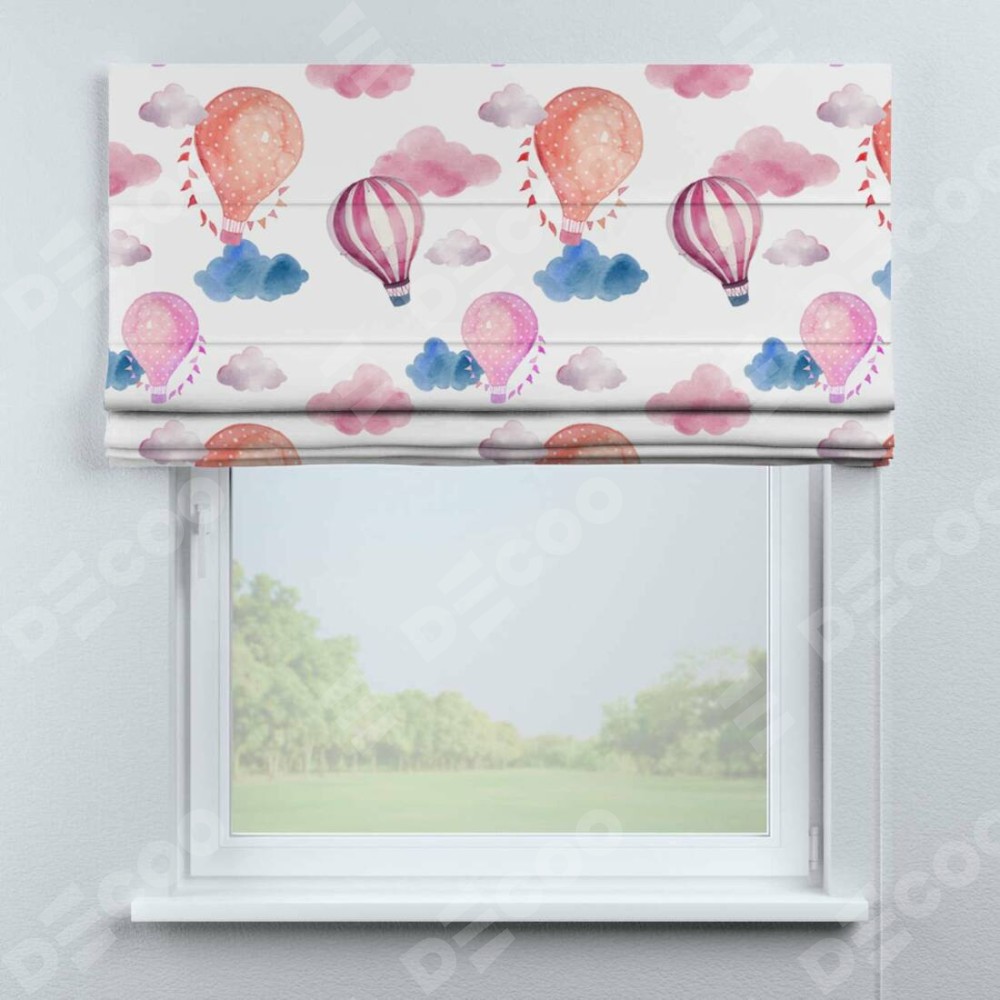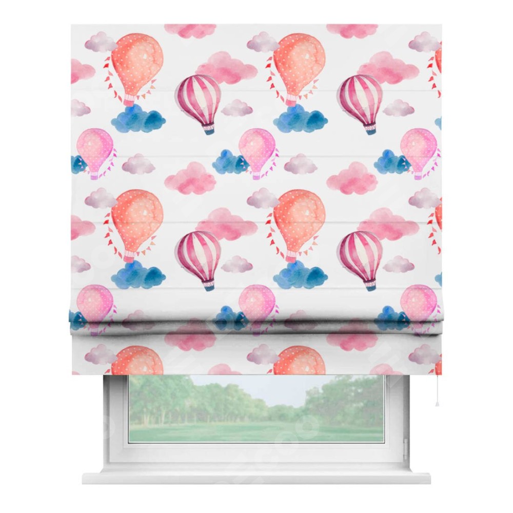 Римская штора производителя «Cortin», используется для проёма, пошита из ткани блэкаут с нанесением сублимационной печати «Полёт в облаках». Имеет универсальный механизм и подходит для монтажа: на потолок, на стену и в нишу.