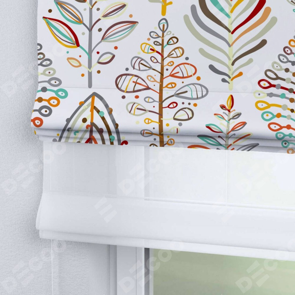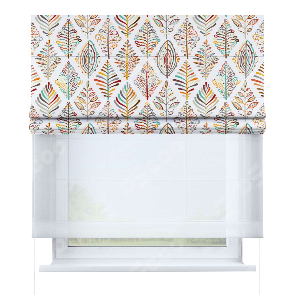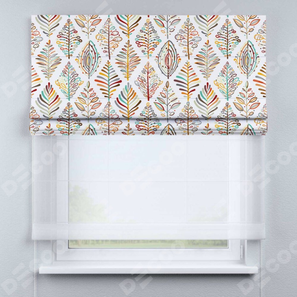 Римская штора день-ночь производителя «Cortin», используется для проёма, пошита из двух полотен, с лицевой блэкаут с нанесением сублимационной печати «Растительные ромбы», вторая ткань тюль (по стандарту комплектуется тюль белого цвета артикул V-01). Имеет универсальный механизм и подходит для монтажа: на потолок, на стену и в нишу.
