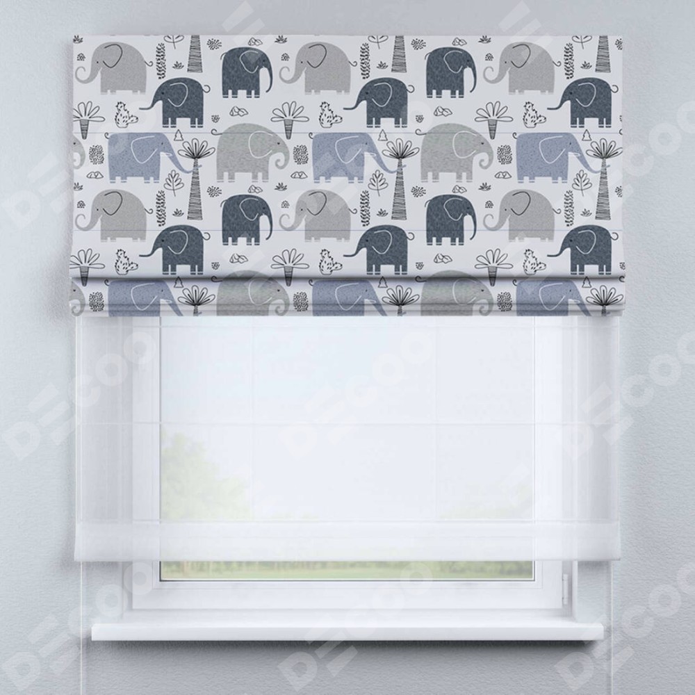 Римская штора день-ночь производителя «Cortin», используется для проёма, пошита из двух полотен, с лицевой блэкаут с нанесением сублимационной печати «Серые слоники», вторая ткань тюль (по стандарту комплектуется тюль белого цвета артикул V-01). Имеет универсальный механизм и подходит для монтажа: на потолок, на стену и в нишу.