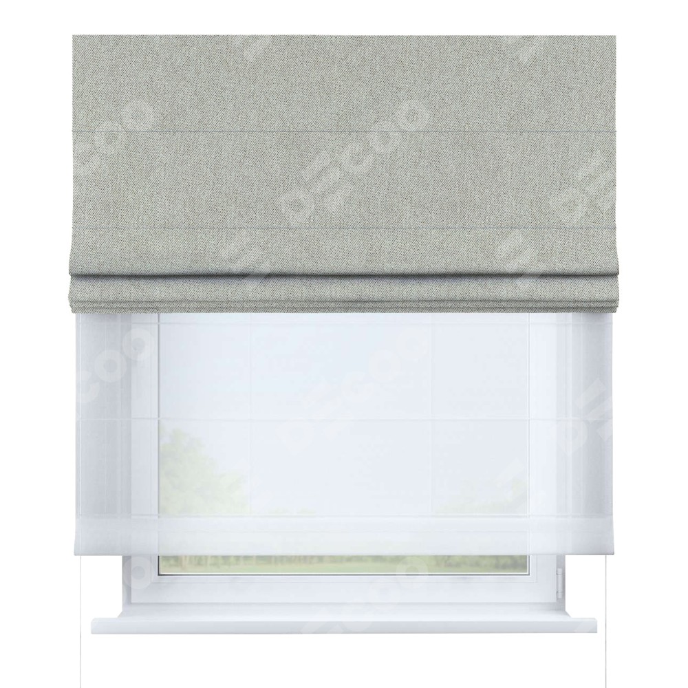 Римская штора день-ночь производителя «Cortin», используется для проёма, пошита из двух полотен, с лицевой стороны твид блэкаут коричнево-серый артикул 21574, вторая ткань тюль (по стандарту комплектуется тюль белого цвета артикул V-01). Имеет универсальный механизм и подходит для монтажа: на потолок, на стену и в нишу.