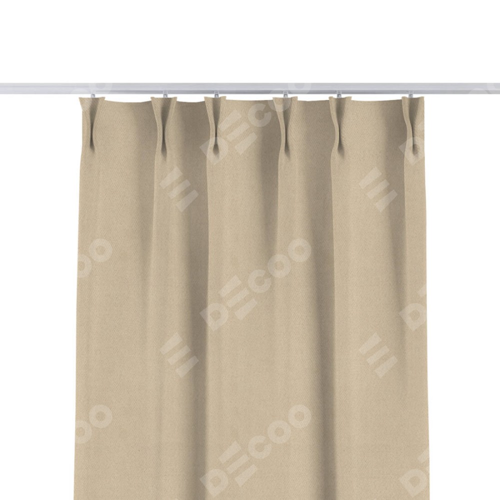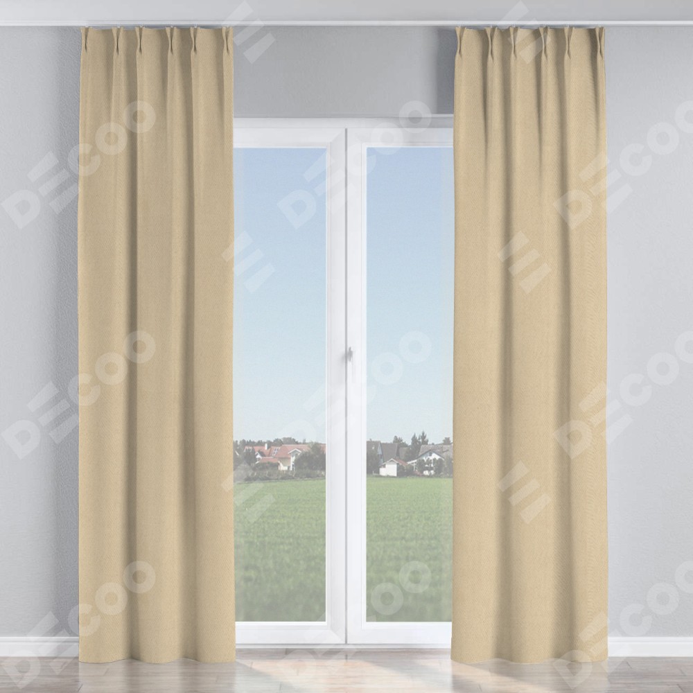 Комплект прямых штор, от производителя «Cortin», пошиты из ткани блэкаут однотонный кофейно-бежевый, артикул ткани 12095−1. С изнаночной стороны в верхней части штор пристрачивается шторная лента с декоративными складками «Кустик». Для создания элегантных складок прямые шторы шьются по стандарту с коэффициентом 1:2 (на 100 см. ширины проёма 200 см. ширины ткани).