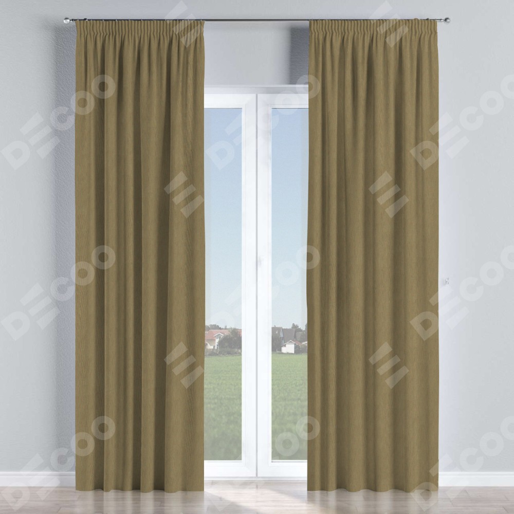 Комплект прямых штор, от производителя «Cortin», пошиты из ткани блэкаут однотонный бежево-золотой, артикул ткани 12095−2. С изнаночной стороны в верхней части штор пристрачивается шторная лента с декоративными складками «Карандаш». Для создания элегантных складок прямые шторы шьются по стандарту с коэффициентом 1:2 (на 100 см. ширины проёма 200 см. ширины ткани).