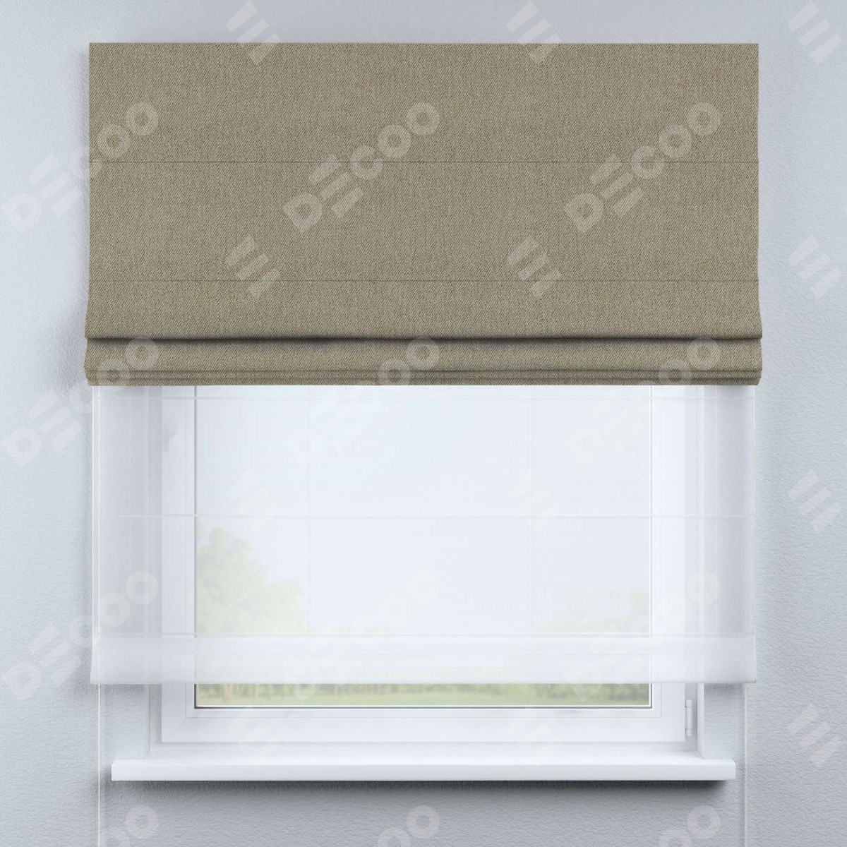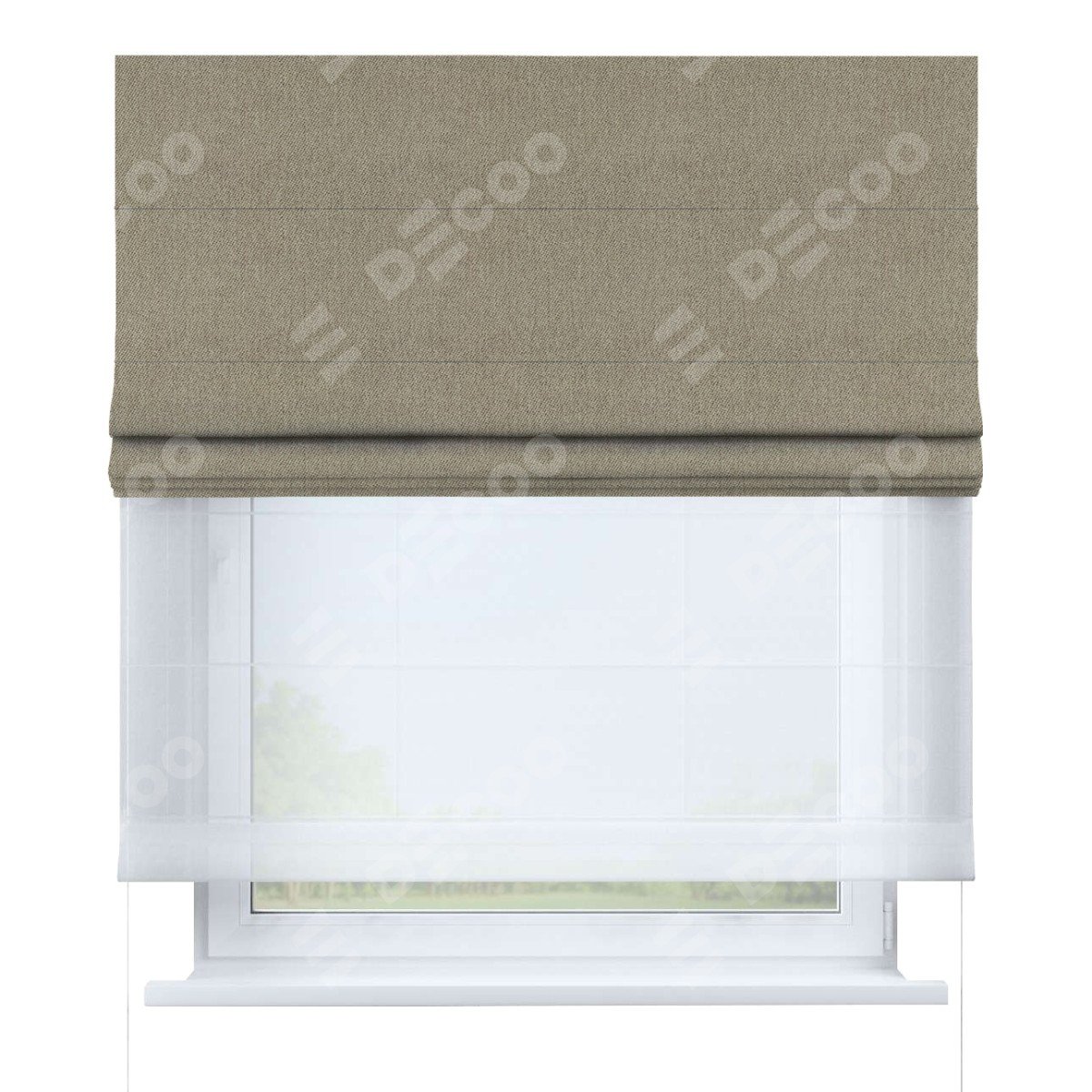 Римская штора день-ночь производителя «Cortin», используется для проёма, пошита из двух полотен, с лицевой стороны твид блэкаут кофе артикул 21575, вторая ткань тюль (по стандарту комплектуется тюль белого цвета артикул V-01). Имеет универсальный механизм и подходит для монтажа: на потолок, на стену и в нишу.