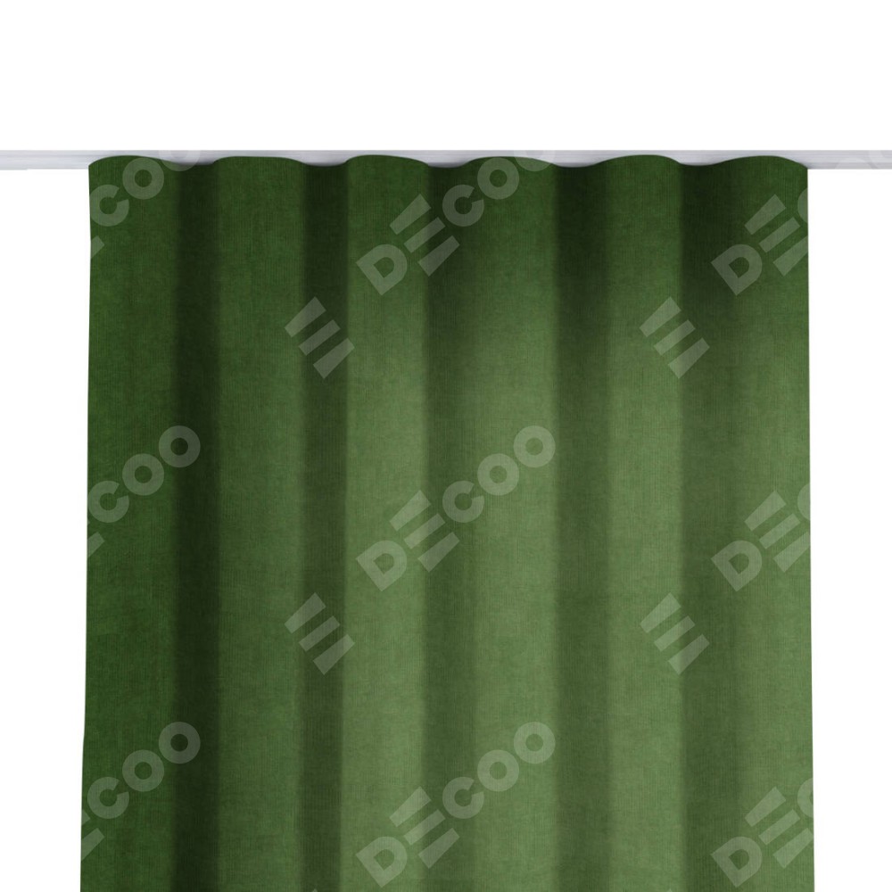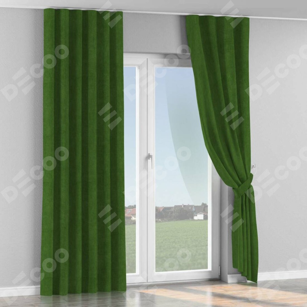 Комплект прямых штор, от производителя «Cortin», пошиты из ткани вельвет тёмно-салатовый, артикул ткани 33805. С изнаночной стороны в верхней части штор пристрачивается шторная лента с декоративными складками «Волна». Для создания элегантных складок прямые шторы шьются по стандарту с коэффициентом 1:2 (на 100 см. ширины проёма 200 см. ширины ткани).