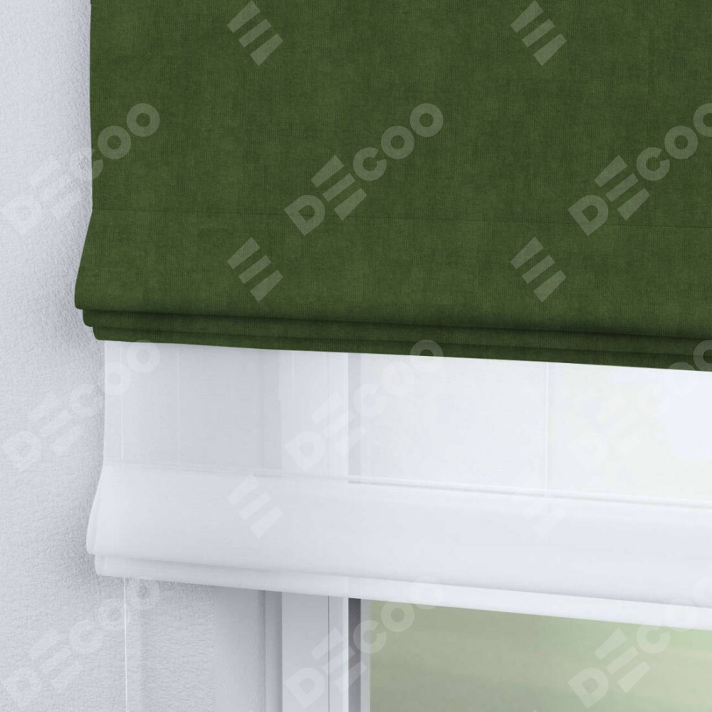 Римская штора день-ночь производителя «Cortin», используется для проёма, пошита из двух полотен, с лицевой стороны вельвет тёмно-салатовый артикул 33805, вторая ткань тюль (по стандарту комплектуется тюль белого цвета артикул V-01). Имеет универсальный механизм и подходит для монтажа: на потолок, на стену и в нишу.