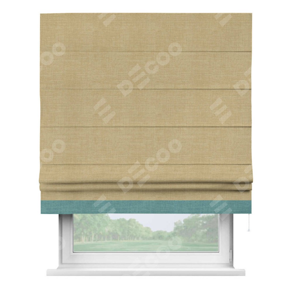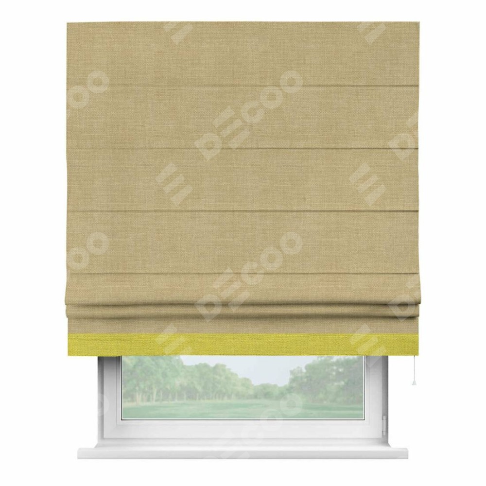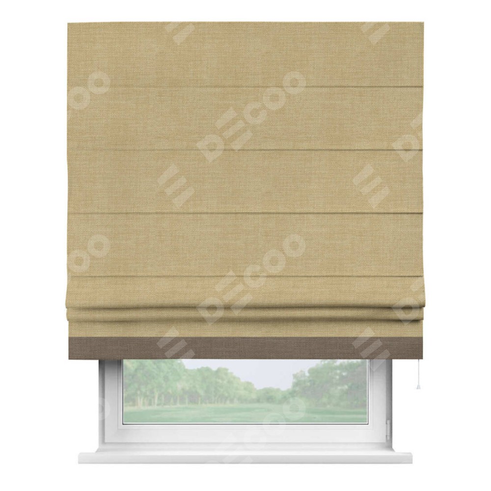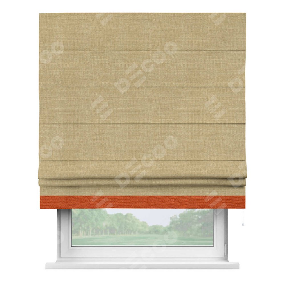Римская штора производителя «Cortin», используется для проёма, пошита из ткани лён бежевый, артикул 7442. Отделка шторы кантом «Джестер», ткань для канта используется из льна разной расцветки на выбор. Имеет универсальный механизм и подходит для монтажа: на потолок, на стену и в нишу.