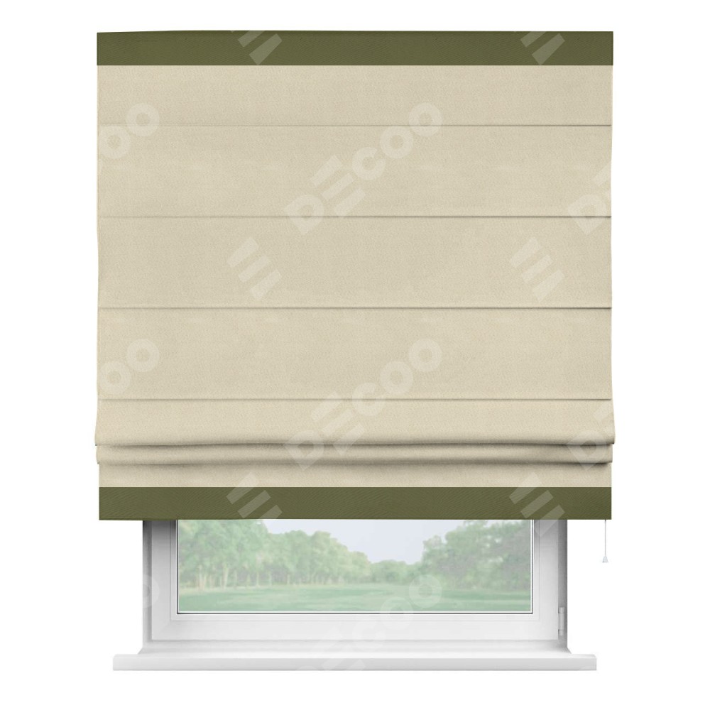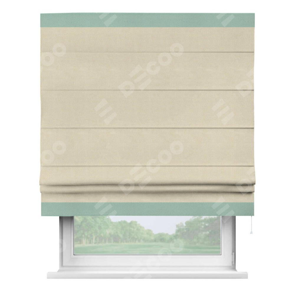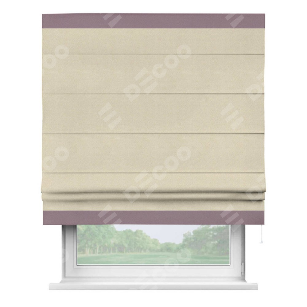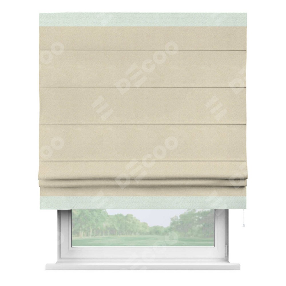 Римская штора производителя «Cortin», используется для проёма, пошита из ткани блэкаут однотонный бежевый, артикул ткани 13125. Отделка шторы кантом «Горизонт», ткань для канта используется из блэкаута однотонного разной расцветки на выбор. Имеет универсальный механизм и подходит для монтажа: на потолок, на стену и в нишу.