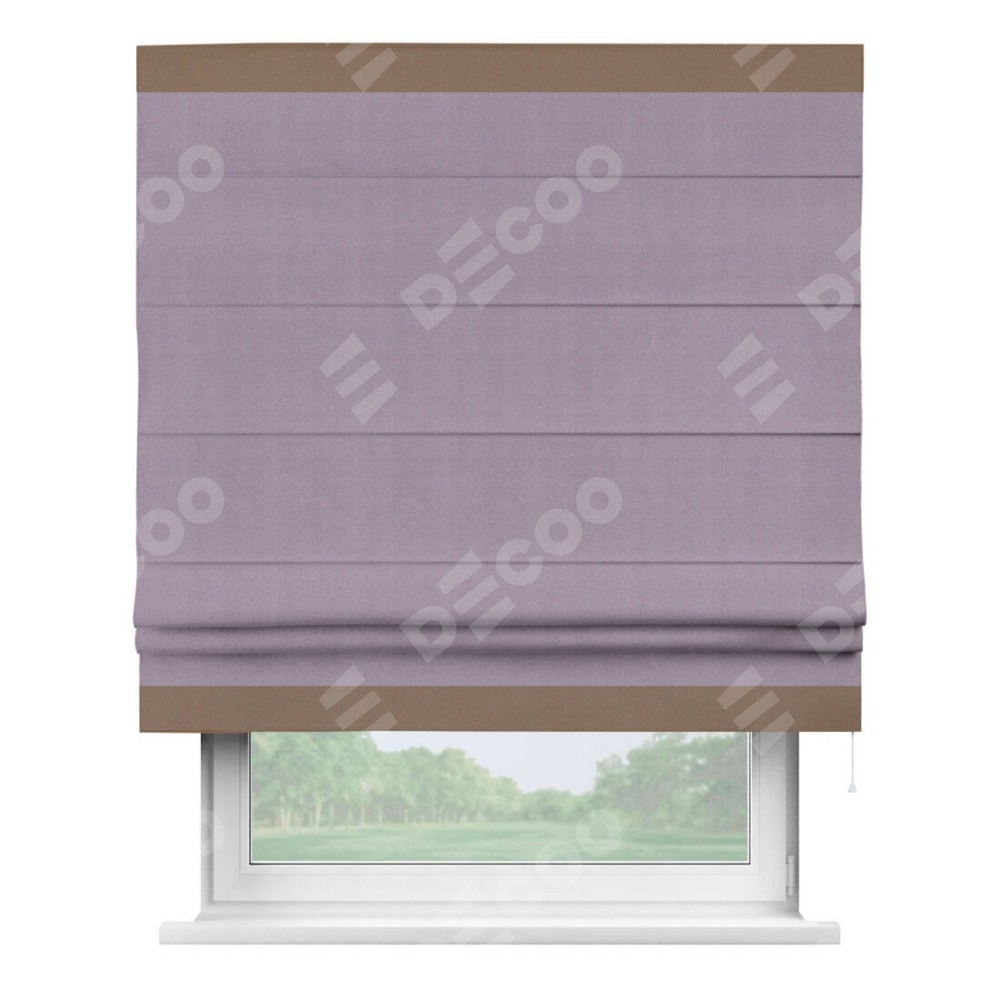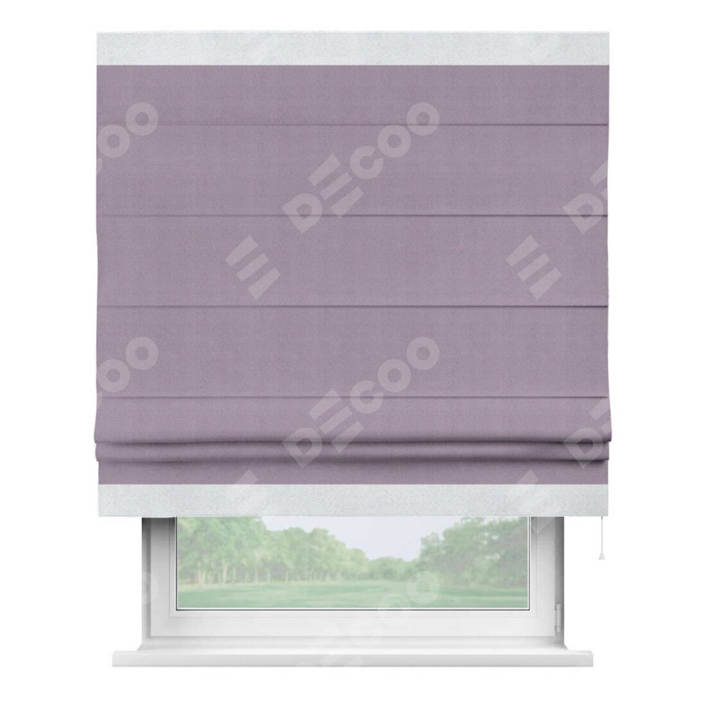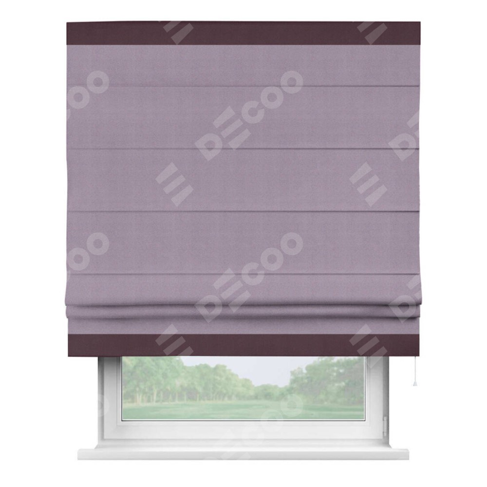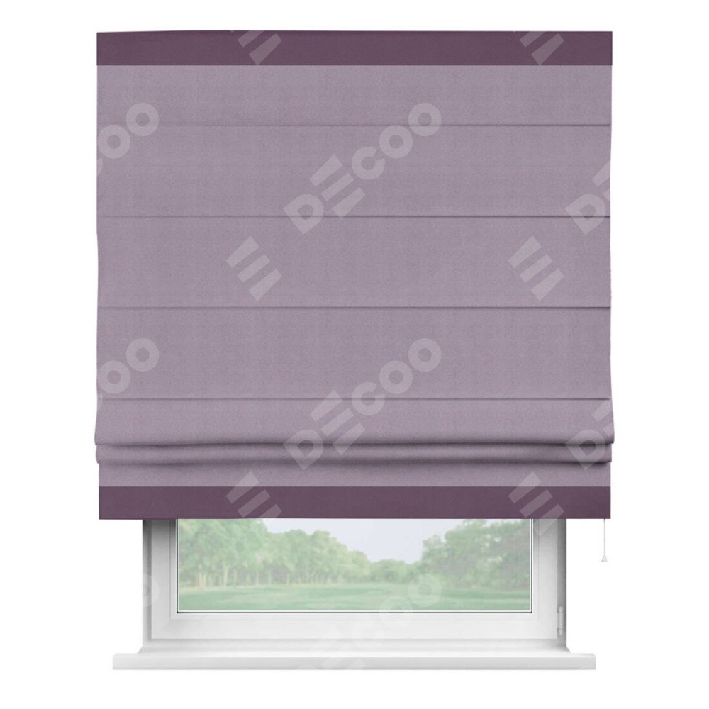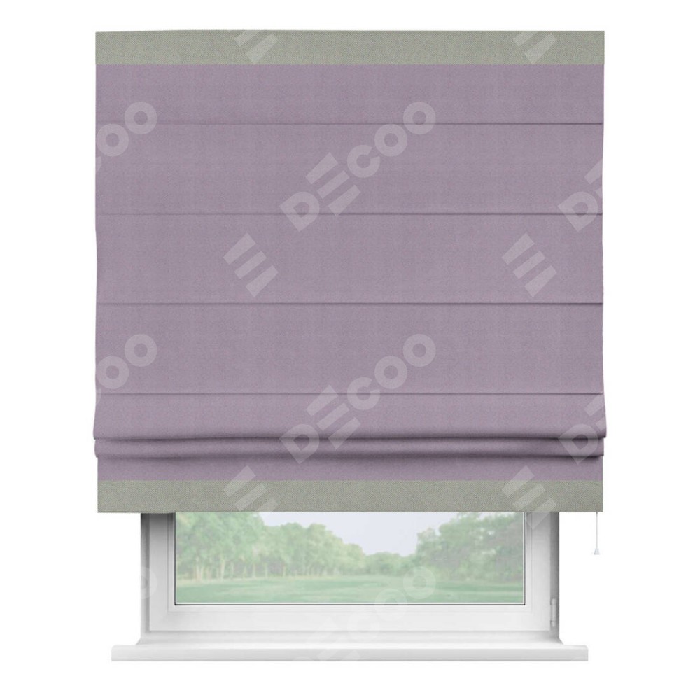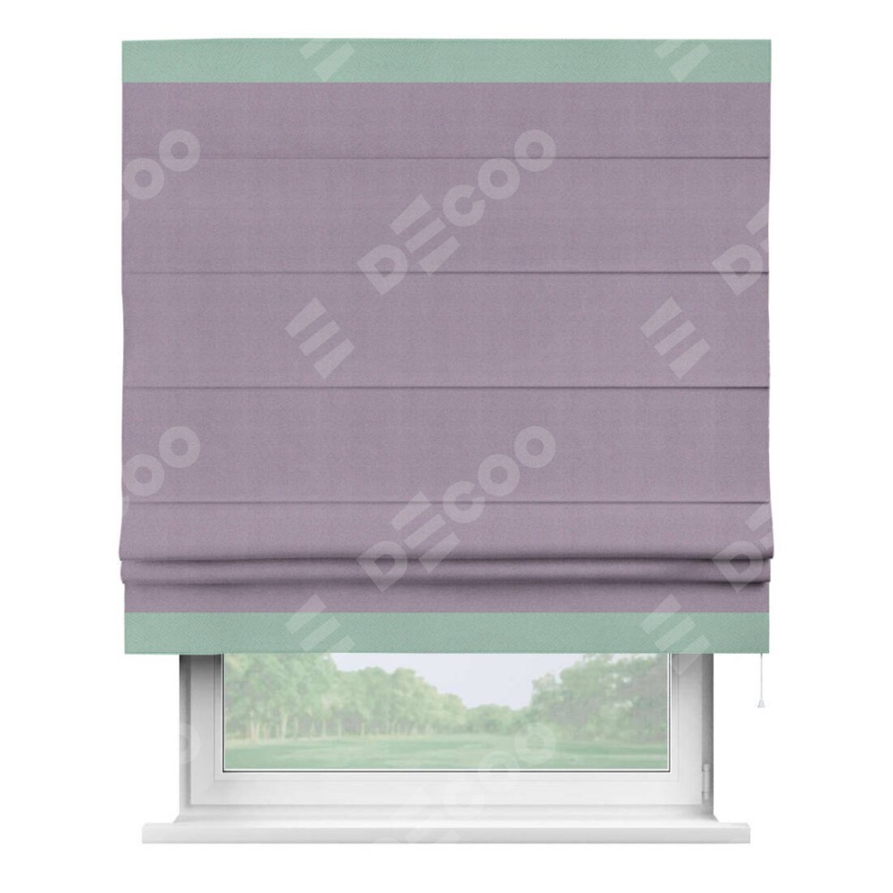 Римская штора производителя «Cortin», используется для проёма, пошита из ткани блэкаут однотонный светло-сиреневый, артикул ткани 29333−1. Отделка шторы кантом «Горизонт», ткань для канта используется из блэкаута однотонного разной расцветки на выбор. Имеет универсальный механизм и подходит для монтажа: на потолок, на стену и в нишу.