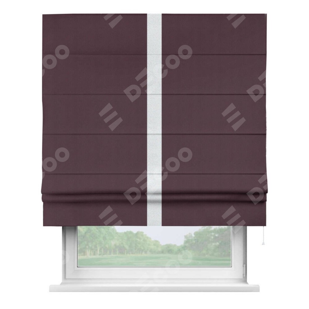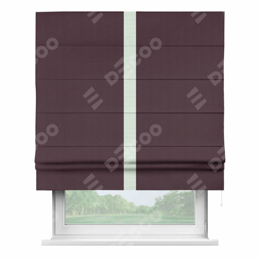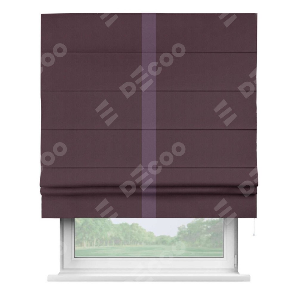 Римская штора производителя «Cortin», используется для проёма, пошита из ткани блэкаут однотонный сиреневый, артикул ткани 29333−2. Отделка шторы кантом «Хайвей», ткань для канта используется из блэкаута однотонного разной расцветки на выбор. Имеет универсальный механизм и подходит для монтажа: на потолок, на стену и в нишу.