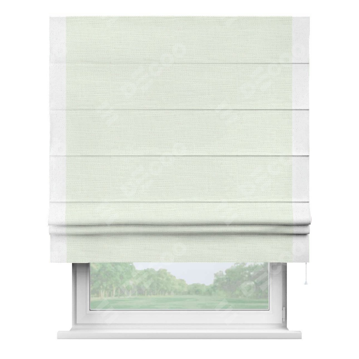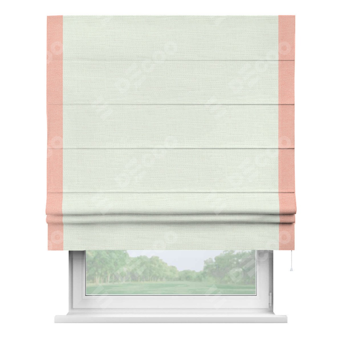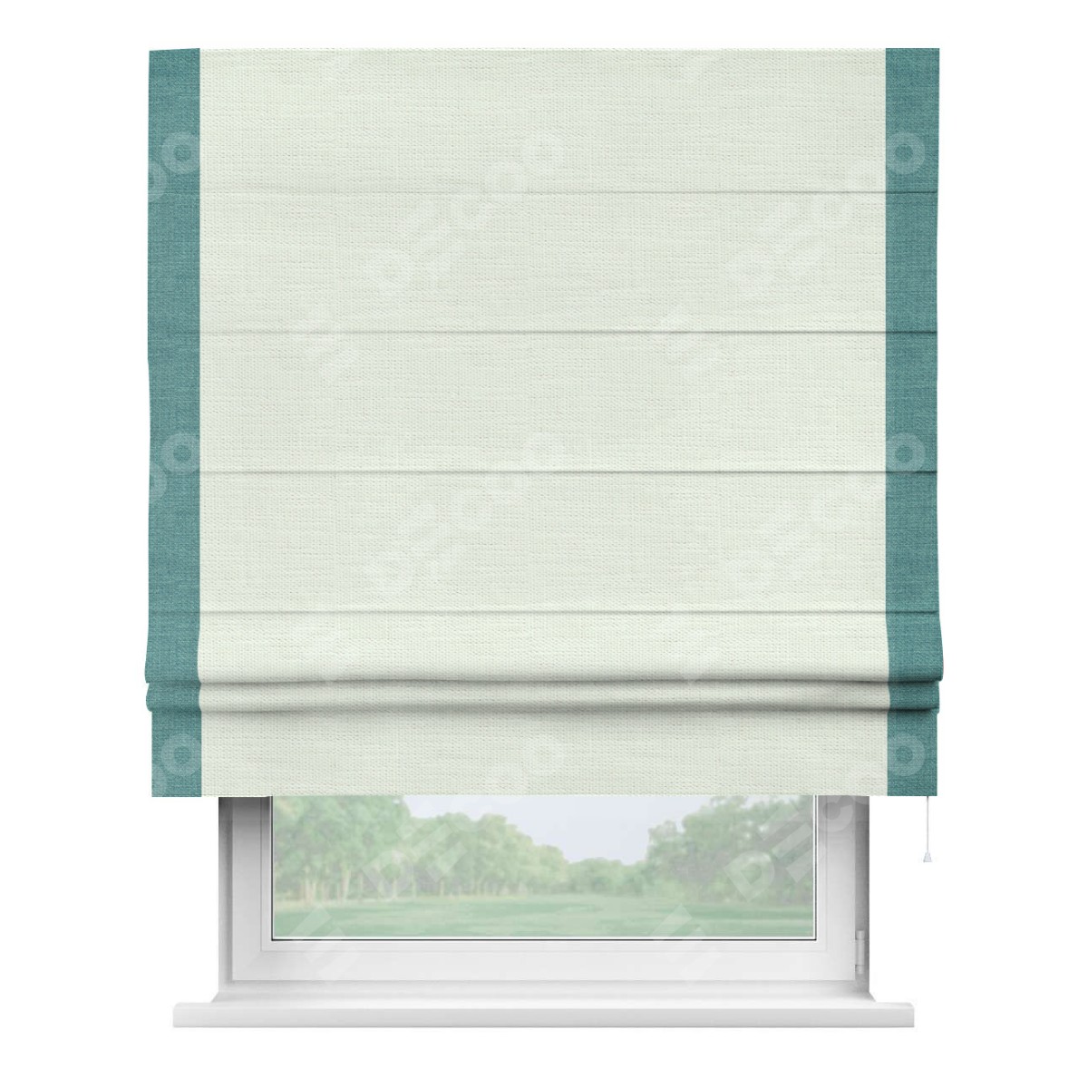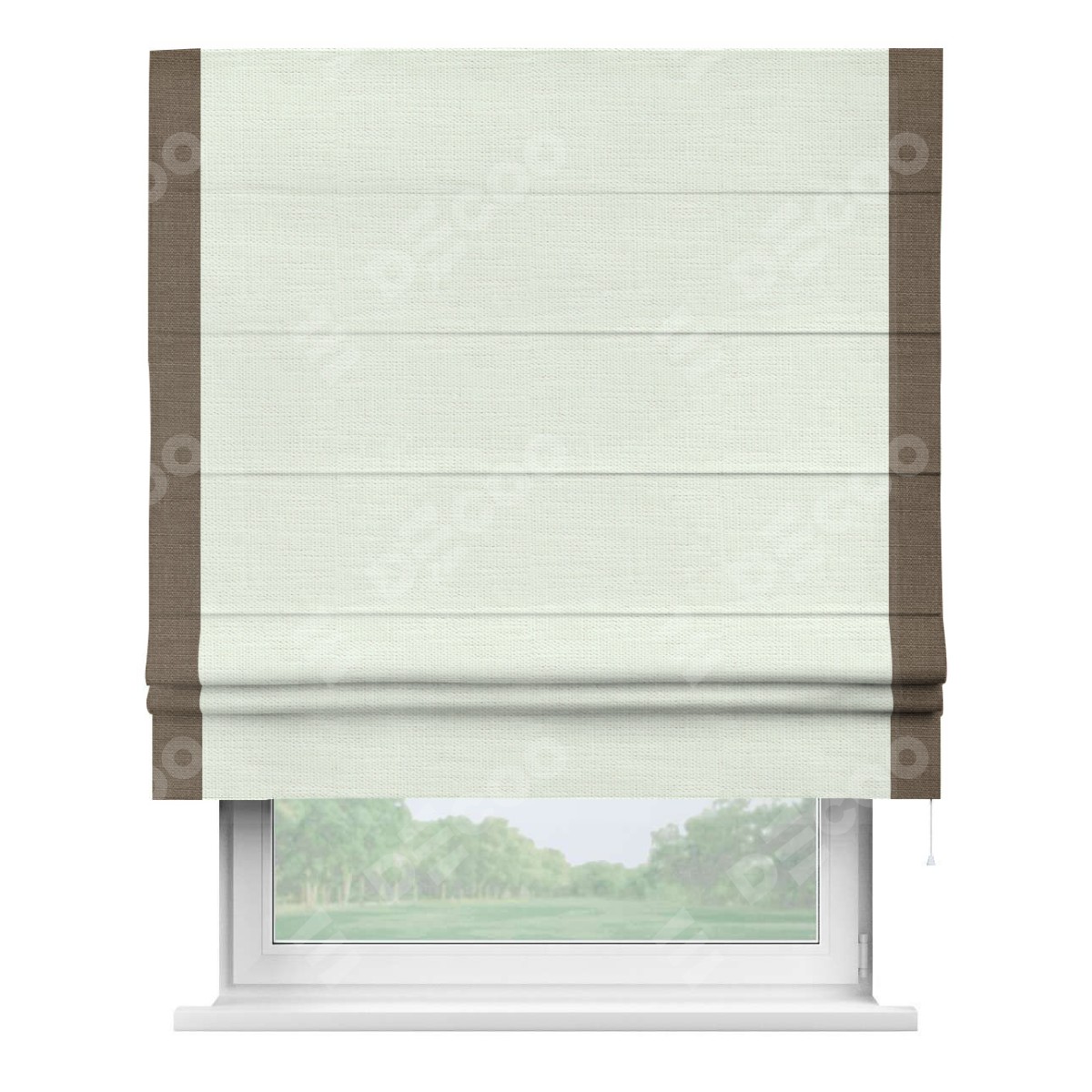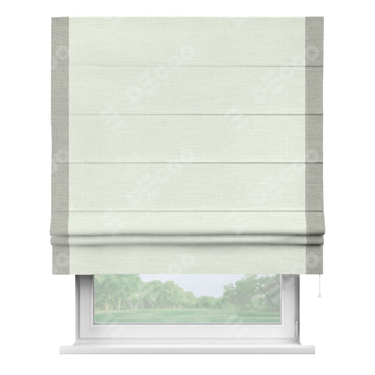 Римская штора производителя «Cortin», используется для проёма, пошита из ткани лён молочный, артикул 23568. Отделка шторы кантом «Стрим Дуо», ткань для канта используется из льна разной расцветки на выбор. Имеет универсальный механизм и подходит для монтажа: на потолок, на стену и в нишу.