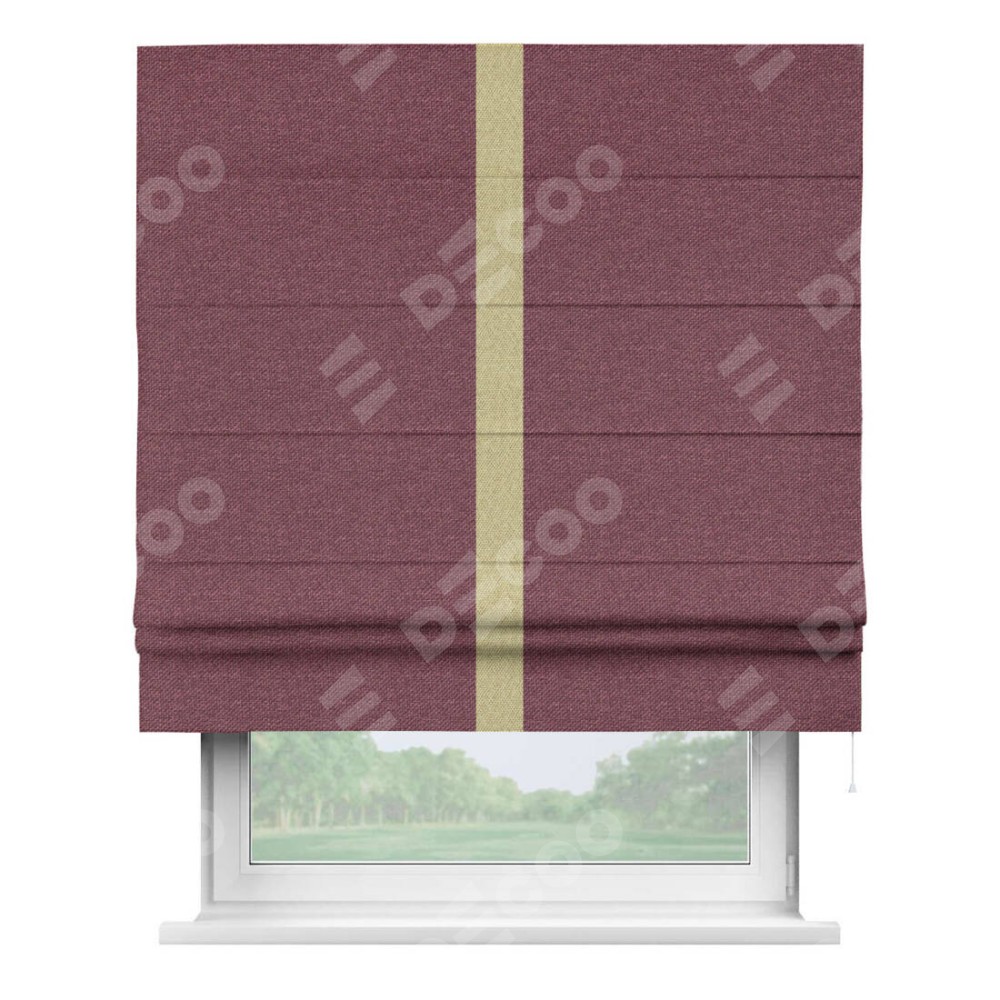 Римская штора производителя «Cortin», используется для проёма, пошита из ткани лён димаут марсала, артикул 1602. Отделка шторы кантом «Хайвэй», ткань для канта используется из льна димаут разной расцветки на выбор. Имеет универсальный механизм и подходит для монтажа: на потолок, на стену и в нишу.
