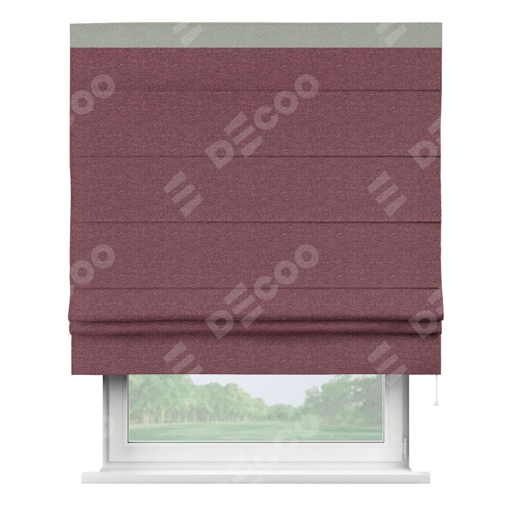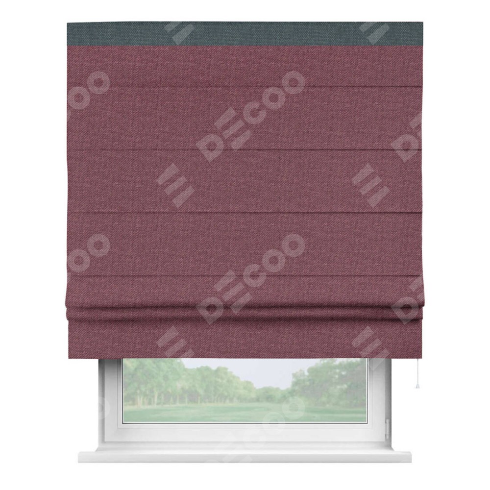 Римская штора производителя «Cortin», используется для проёма, пошита из ткани лён димаут марсала, артикул 1602. Отделка шторы кантом «Кинг», ткань для канта используется из льна димаут разной расцветки на выбор. Имеет универсальный механизм и подходит для монтажа: на потолок, на стену и в нишу.