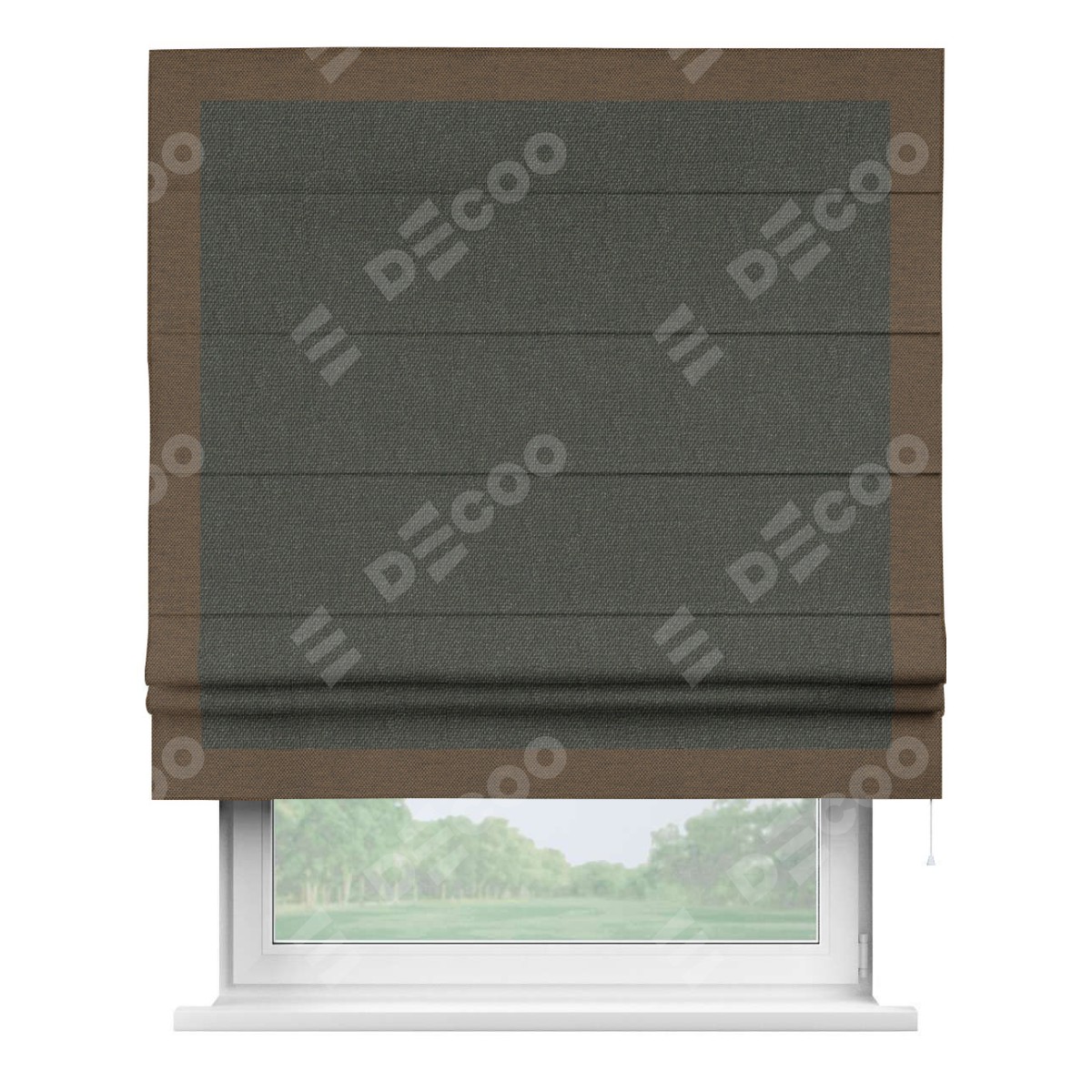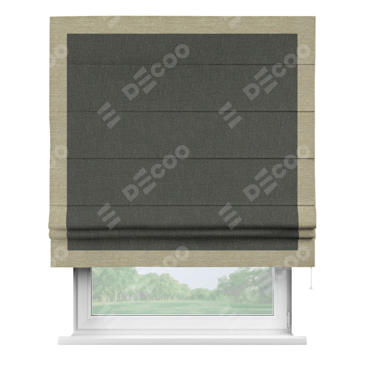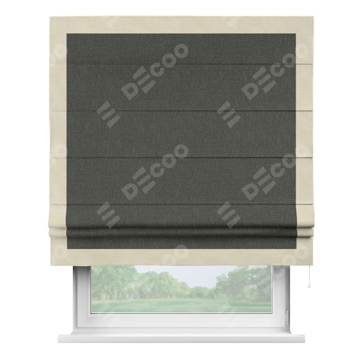 Римская штора производителя «Cortin», используется для проёма, пошита из ткани лён димаут графитово-серый, артикул 35129. Отделка шторы кантом «Чесс», ткань для канта используется из льна димаут разной расцветки на выбор. Имеет универсальный механизм и подходит для монтажа: на потолок, на стену и в нишу.