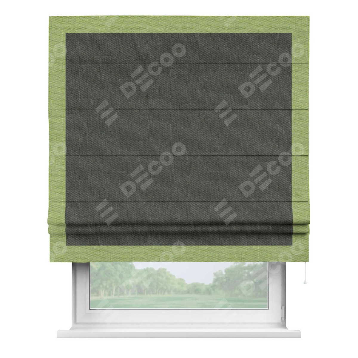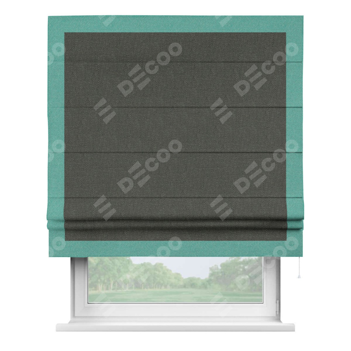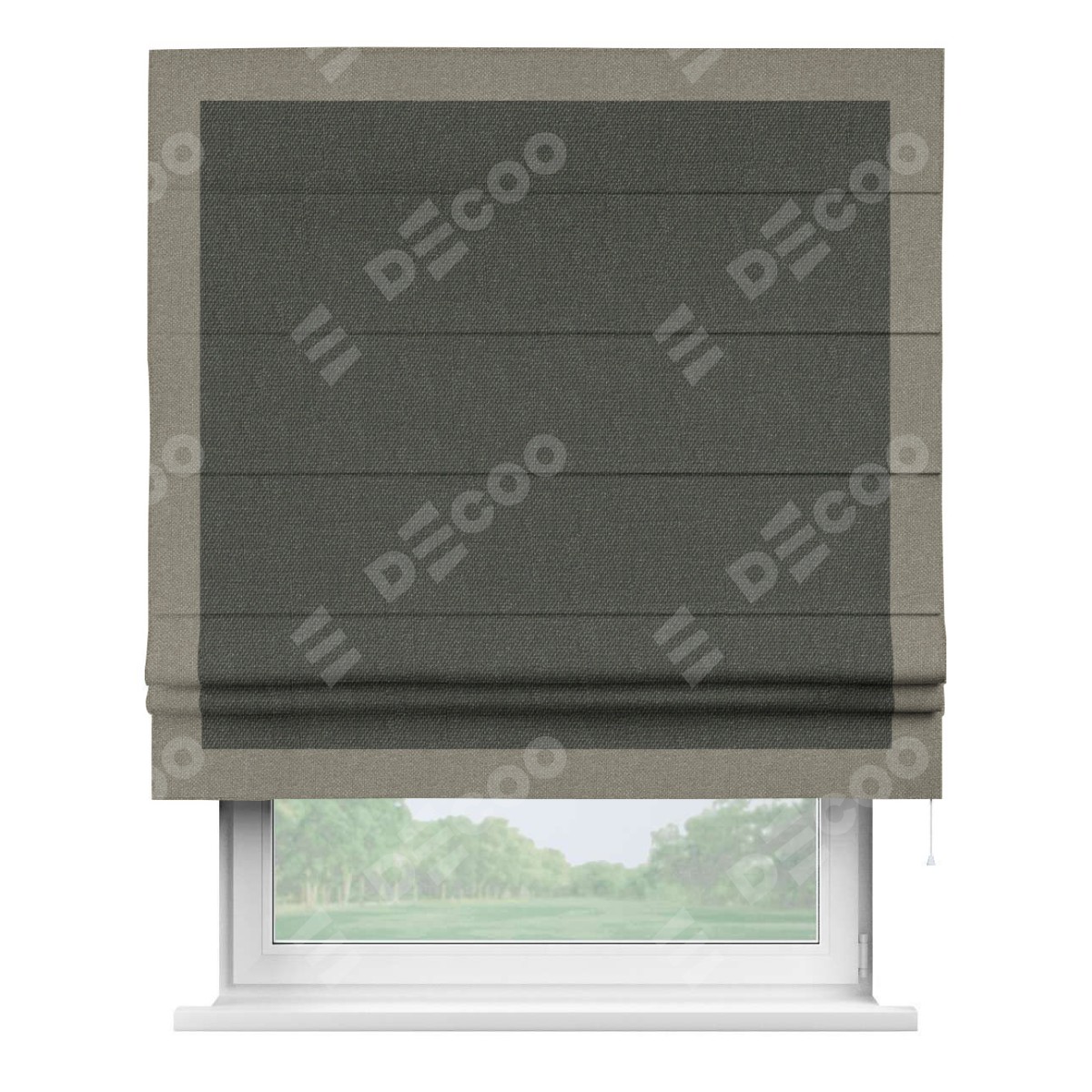 Римская штора производителя «Cortin», используется для проёма, пошита из ткани лён димаут графитово-серый, артикул 35129. Отделка шторы кантом «Чесс», ткань для канта используется из льна димаут разной расцветки на выбор. Имеет универсальный механизм и подходит для монтажа: на потолок, на стену и в нишу.