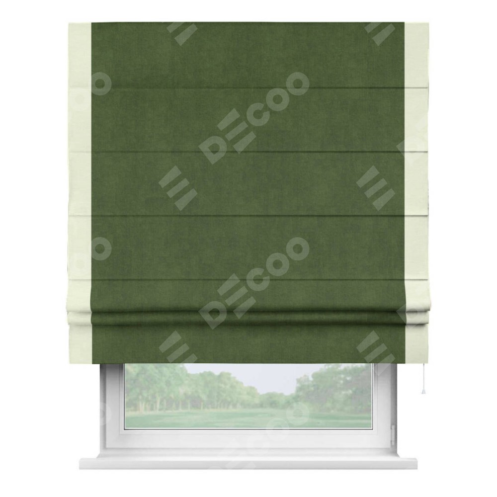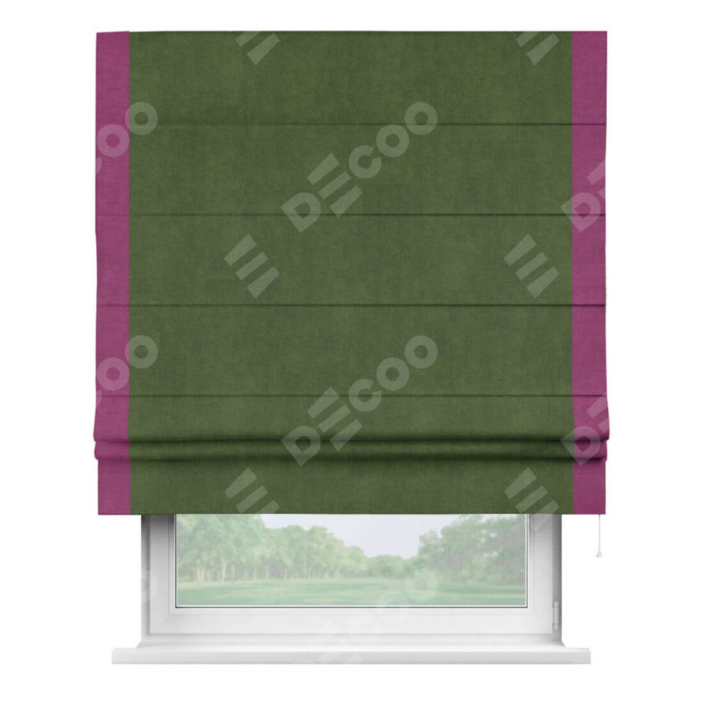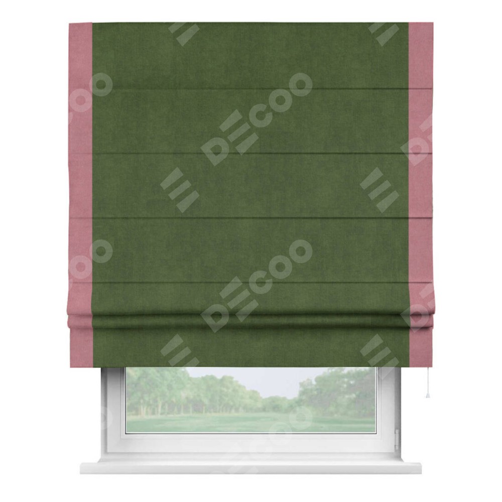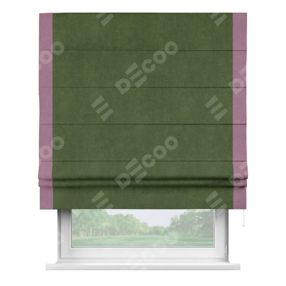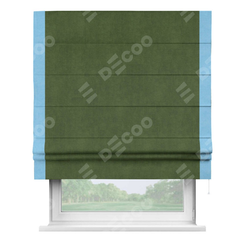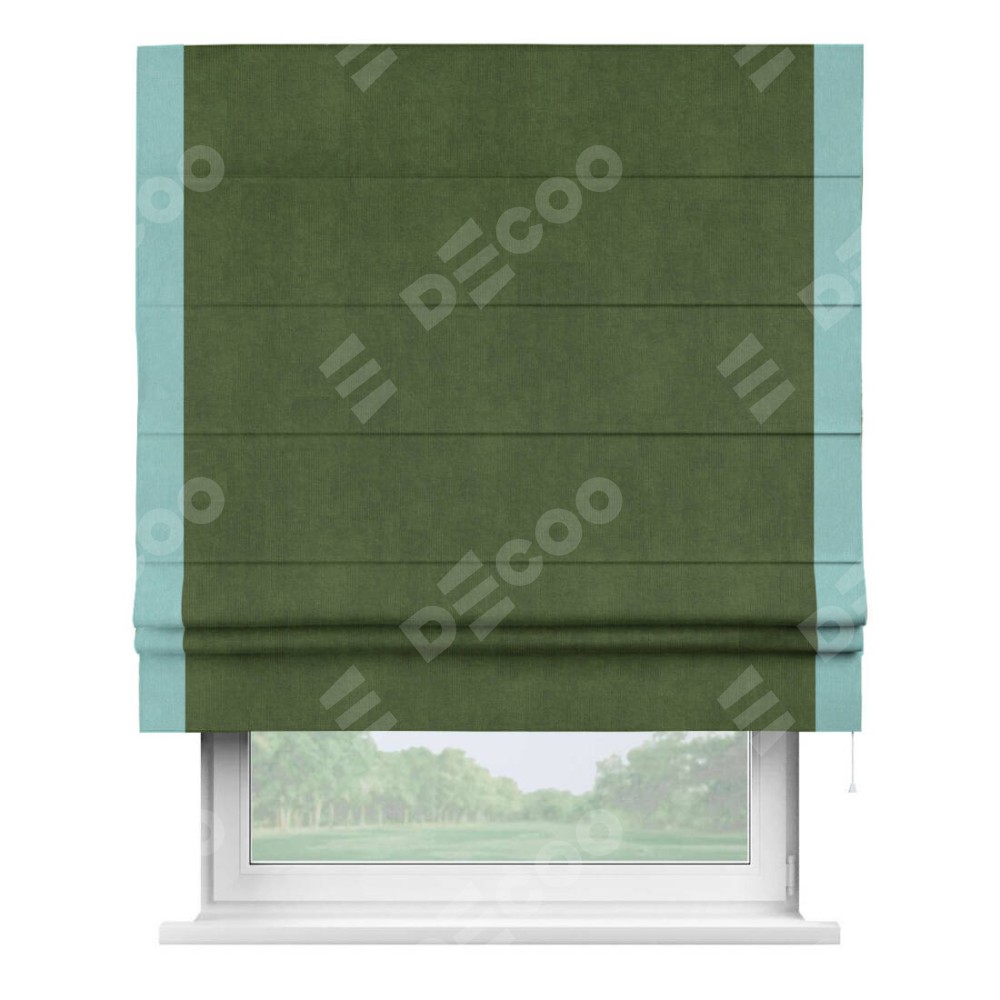 Римская штора производителя «Cortin», используется для проёма, пошита из ткани вельвет тёмно-салатовый, артикул ткани 33805. Отделка шторы кантом «Стрим Дуо», ткань для канта используется из вельвета разной расцветки на выбор. Имеет универсальный механизм и подходит для монтажа: на потолок, на стену и в нишу.