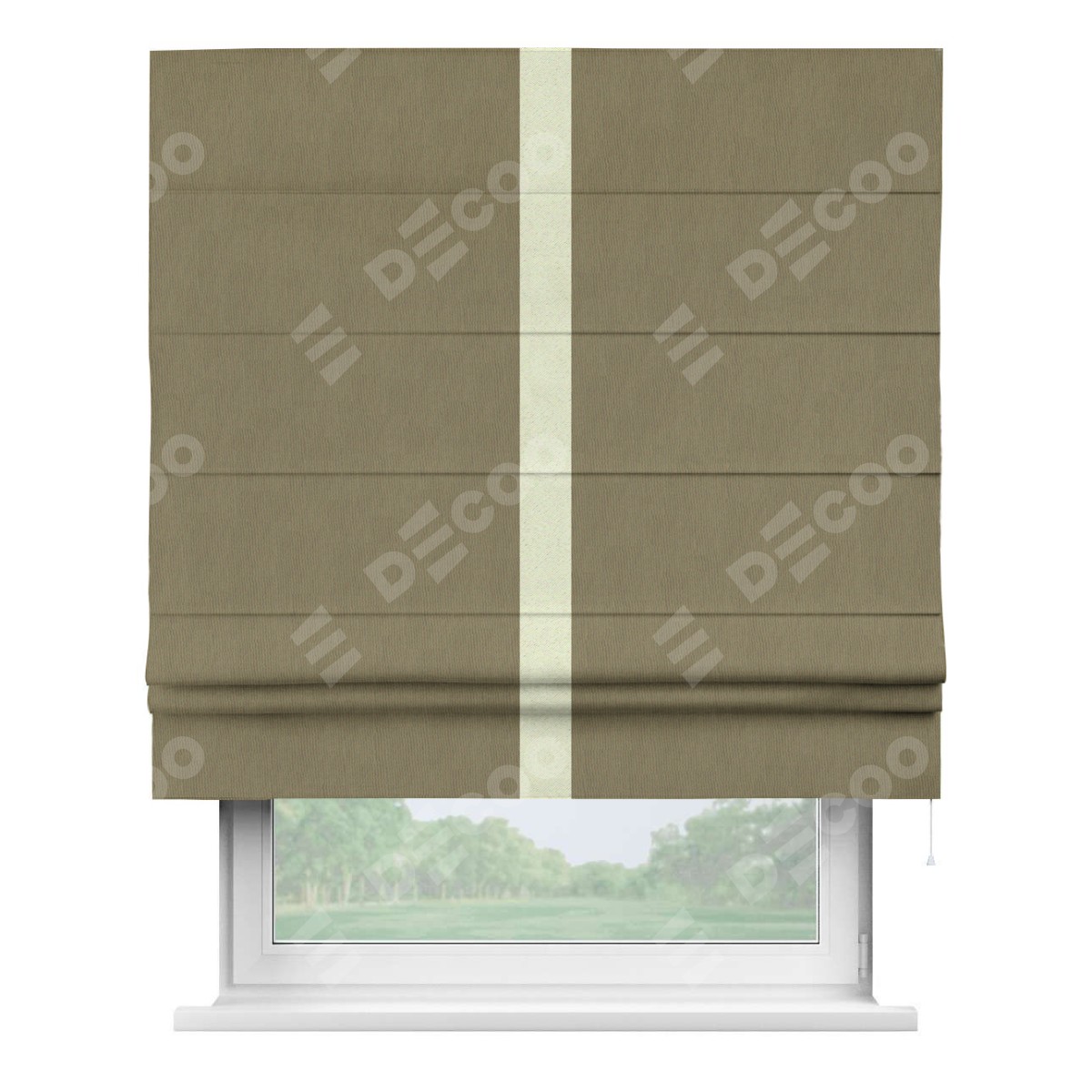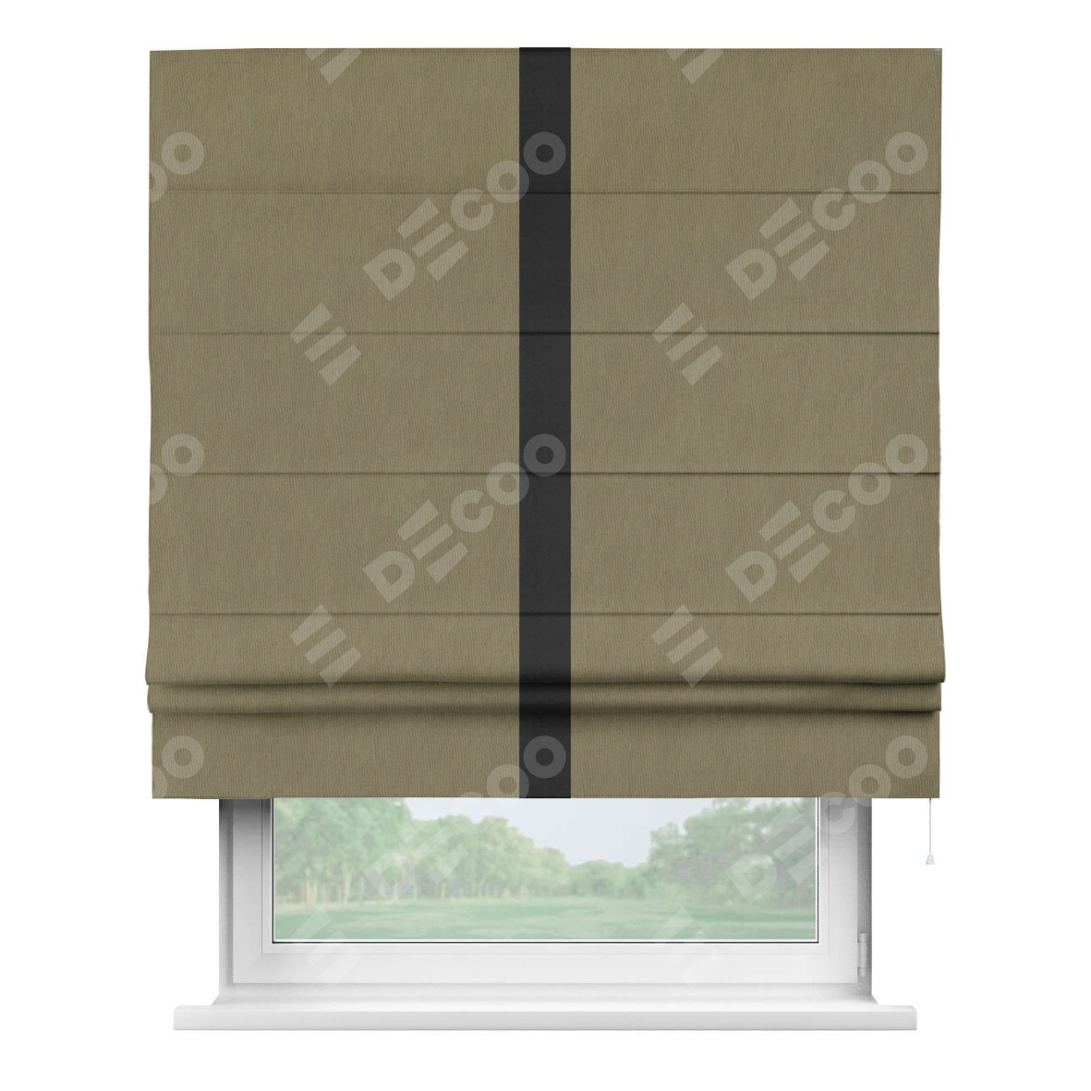 Римская штора производителя «Cortin», используется для проёма, пошита из ткани блэкаут однотонный бежево-золотой, артикул ткани 12095−2. Отделка шторы кантом «Хайвей», ткань для канта используется из блэкаута однотонного разной расцветки на выбор. Имеет универсальный механизм и подходит для монтажа: на потолок, на стену и в нишу.