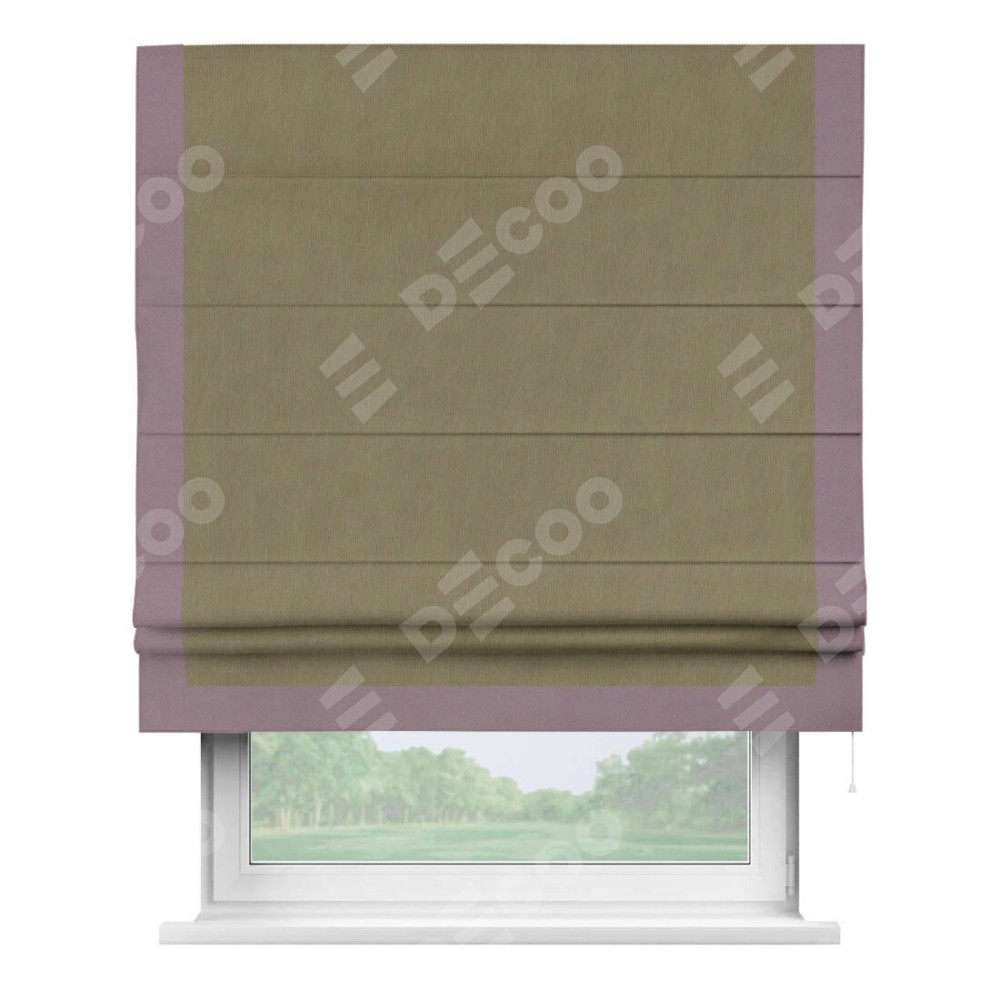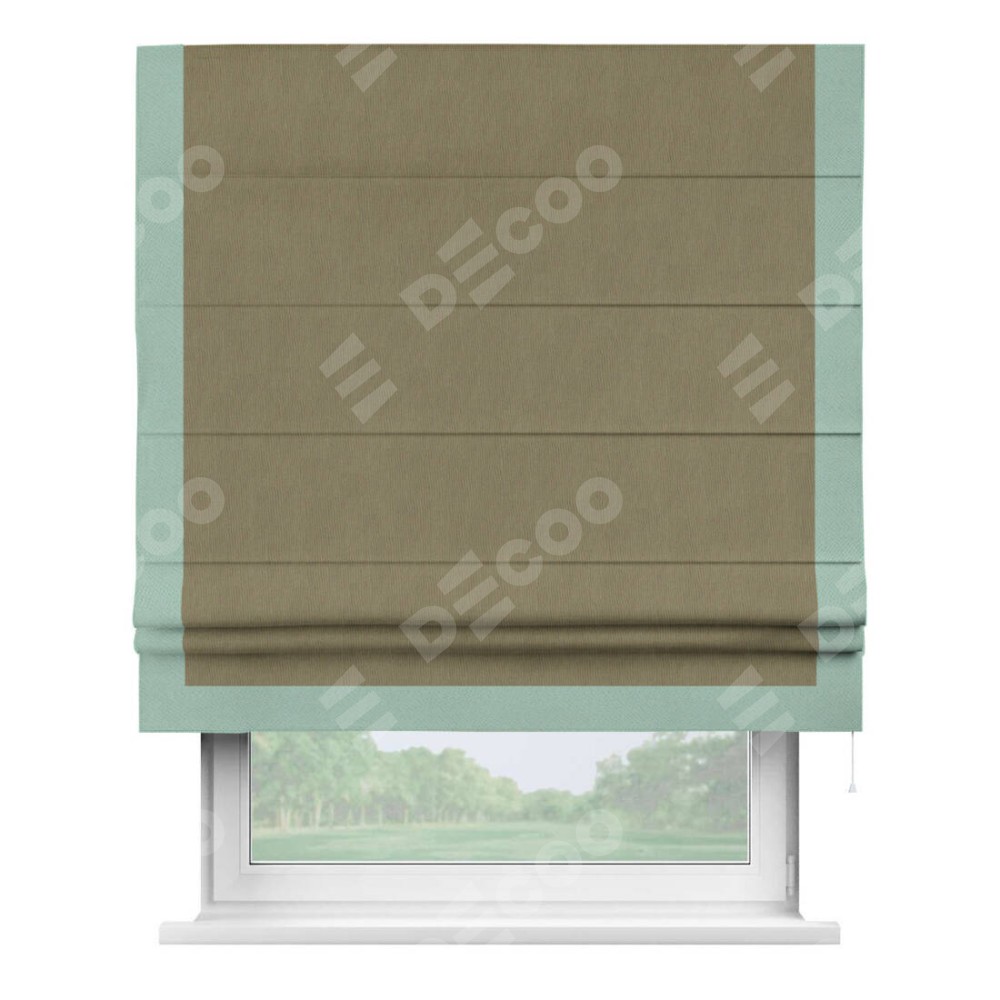 Римская штора производителя «Cortin», используется для проёма, пошита из ткани блэкаут однотонный бежево-золотой, артикул ткани 12095−2. Отделка шторы кантом «Виктория», ткань для канта используется из блэкаута однотонного разной расцветки на выбор. Имеет универсальный механизм и подходит для монтажа: на потолок, на стену и в нишу.